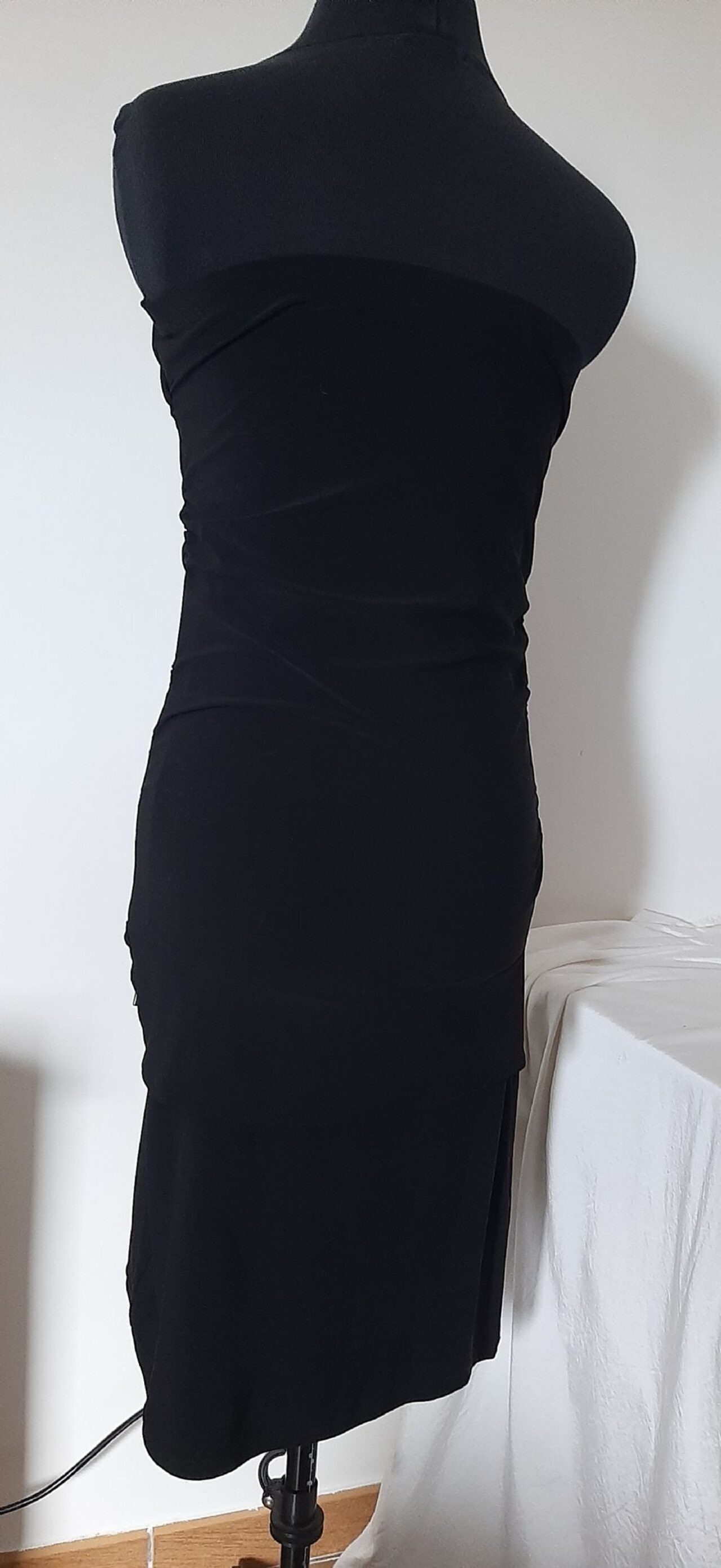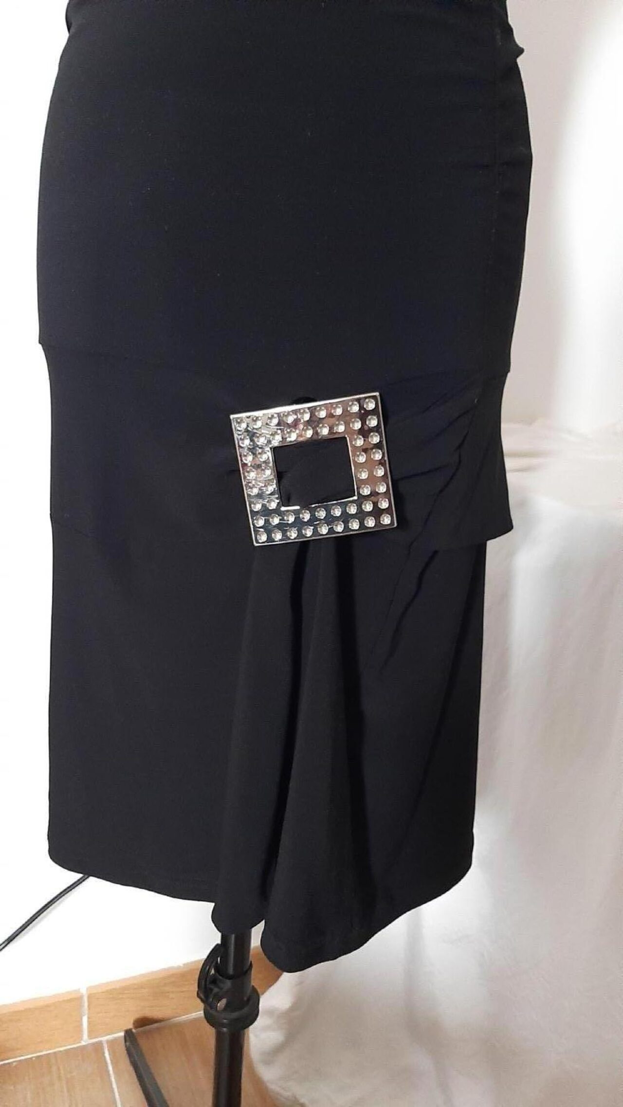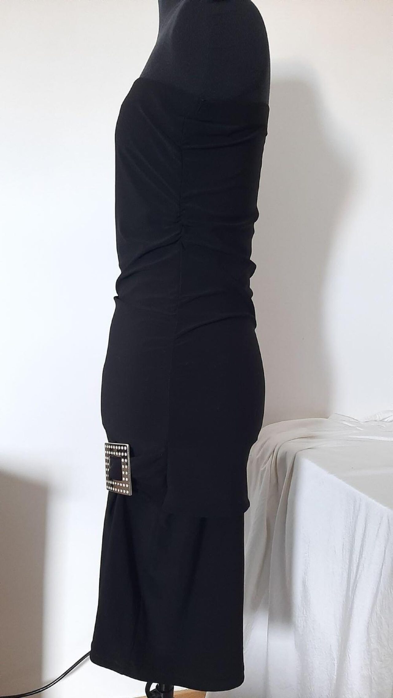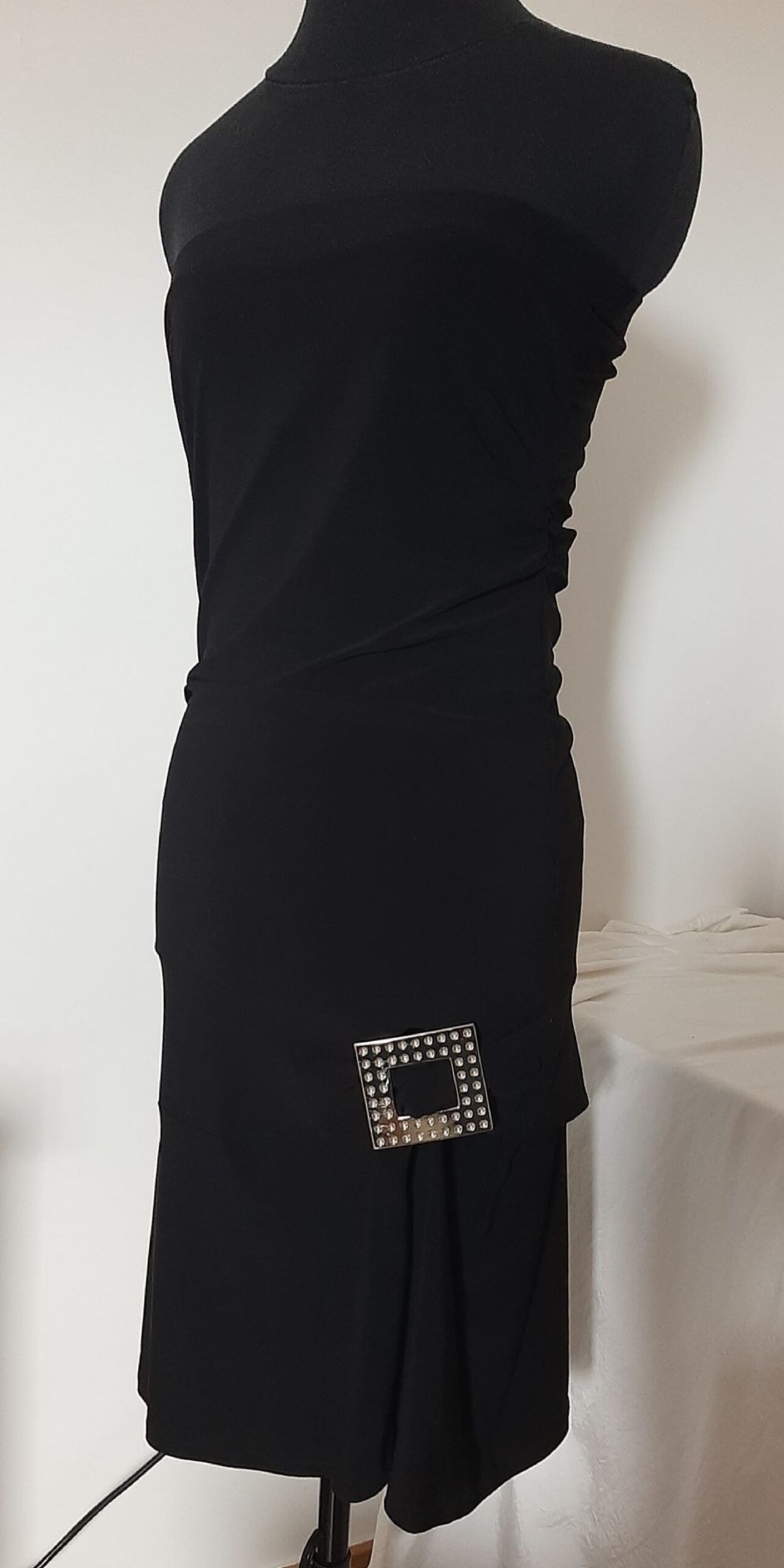 Abito vintage anni 2000, in jersey nero elasticizzato. Modello aderente con arricciatura laterale su entrambi i fianchi, punto vita sceso, gonna leggermente svasata. Dettaglio laterale con volant che passa in una fibbia in plastica argentata.In ottimo stato, unico difetto l''etichetta taglia cancellata.Tessuto in jersey 94% poliestere e 6% elastan.Taglia indicativamente L, misure in foto. .