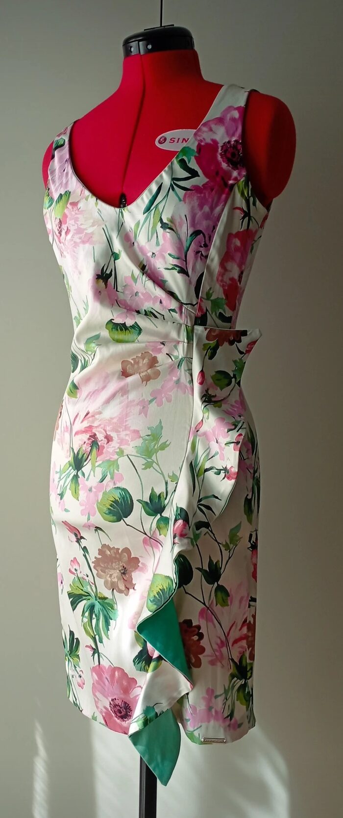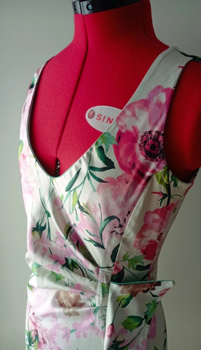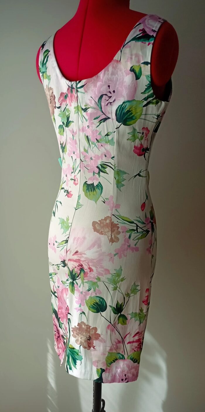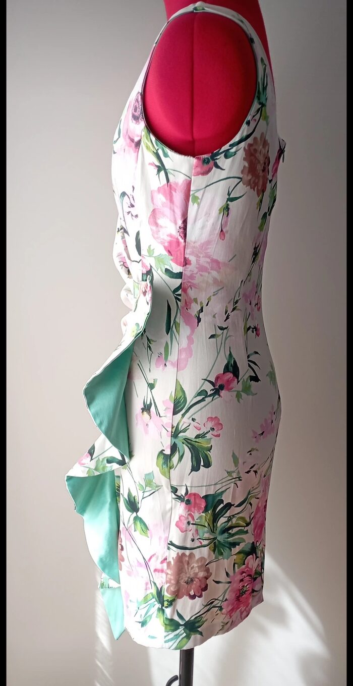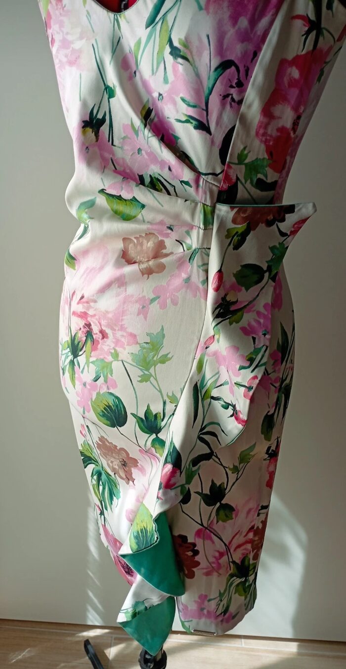 Abito da cocktail in raso elasticizzato a fiori, Rinascimento, made in Italy.