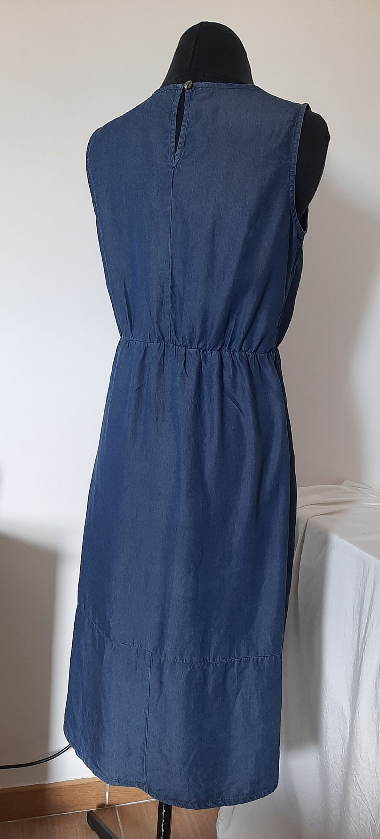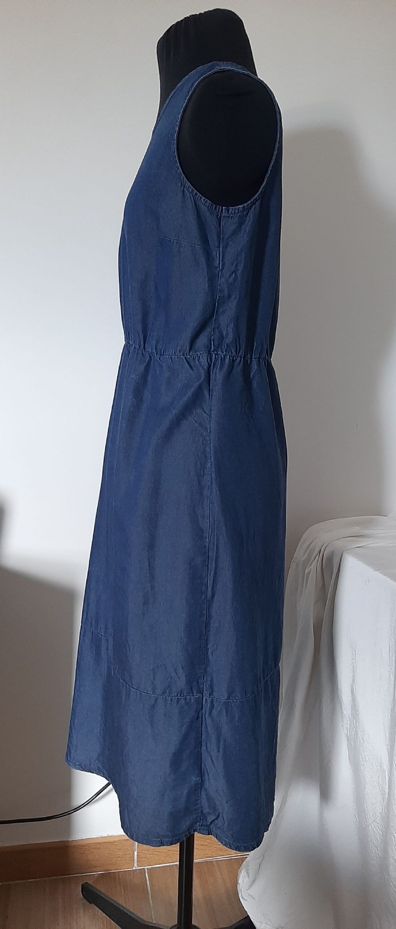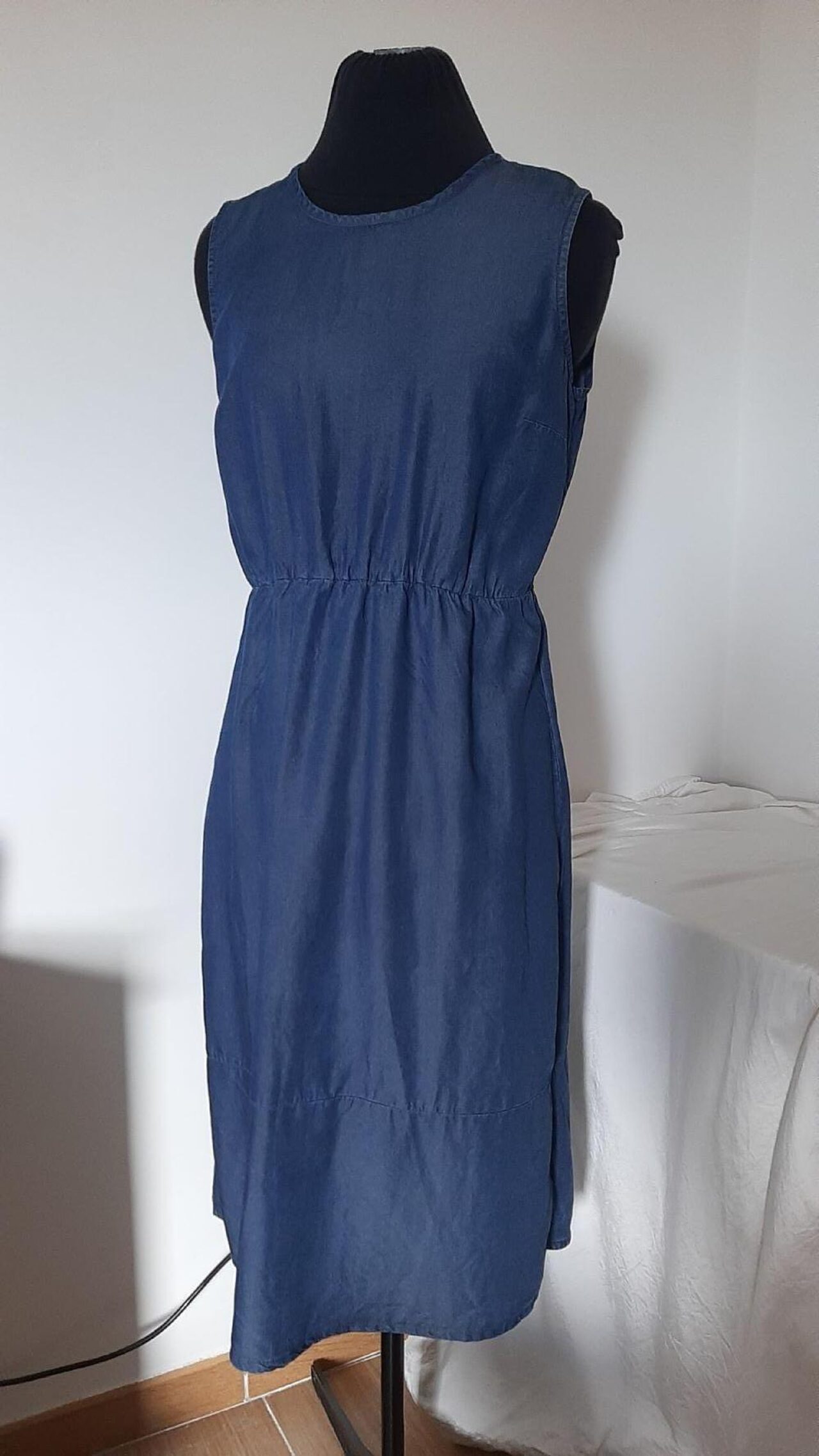 Abito Esmara, longuette in Lyocell, fibra semi sintetica ecologica prodotta dalle piante di eucalipto, simile alla viscosa.Modello smanicato con arricciatura in vita, gonna dritta e chiusura sulla nuca con un bottone.Molto bello anche per il periodo autunnale abbinato ad una camicia o maglioncino.in ottimo stato, non presenta difetti.100% Lyocell.Taglia IT 38, misure in foto .