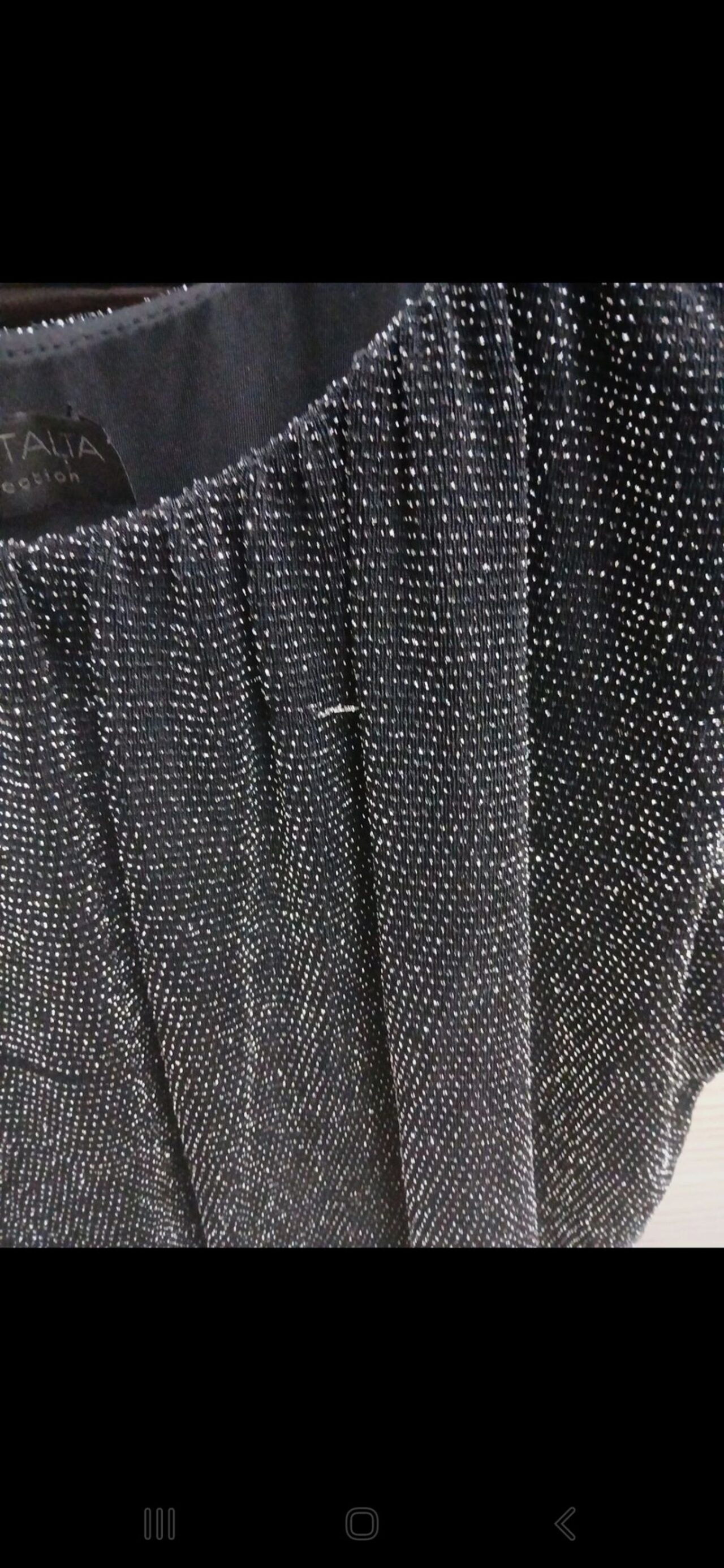 Preso qui. TG. L ma per me è stretto nella parte attillata sui fianchi. Marca piazza Italia. Ha qualche filo metallico tirato come da foto. Metto a 1 credito. Composizione 77% nylon, 18% metallica e 5% elastan. .