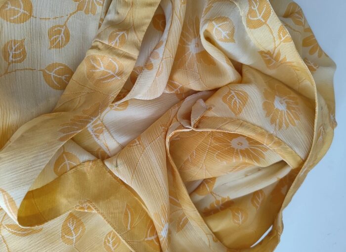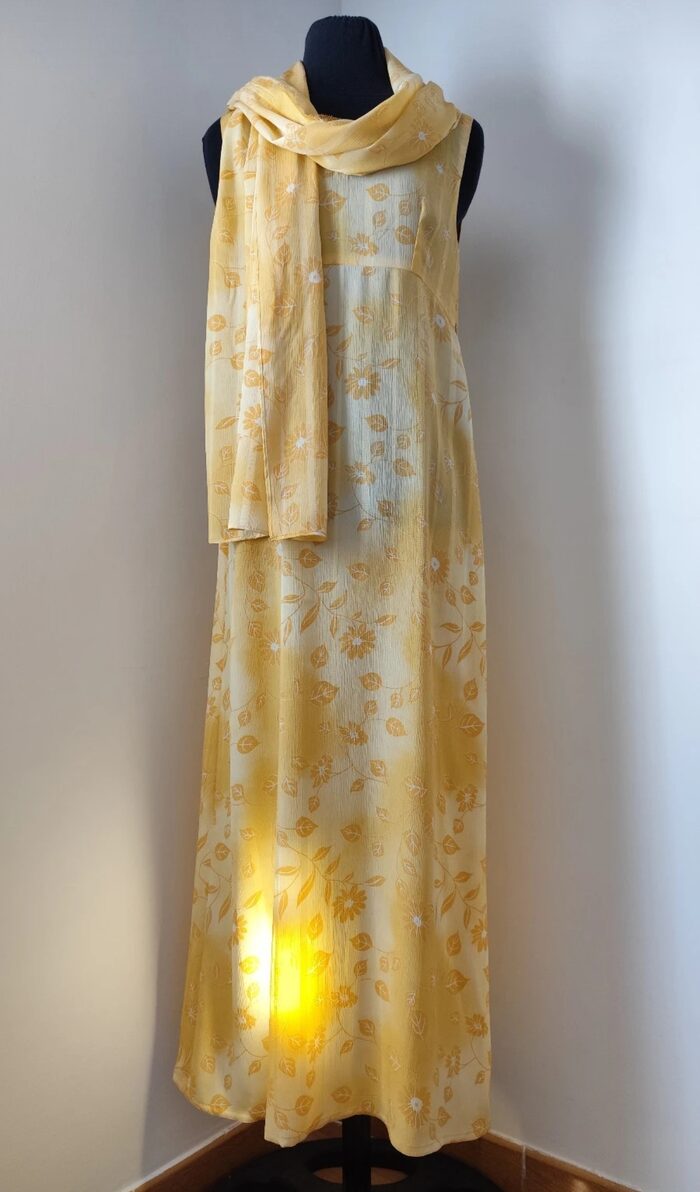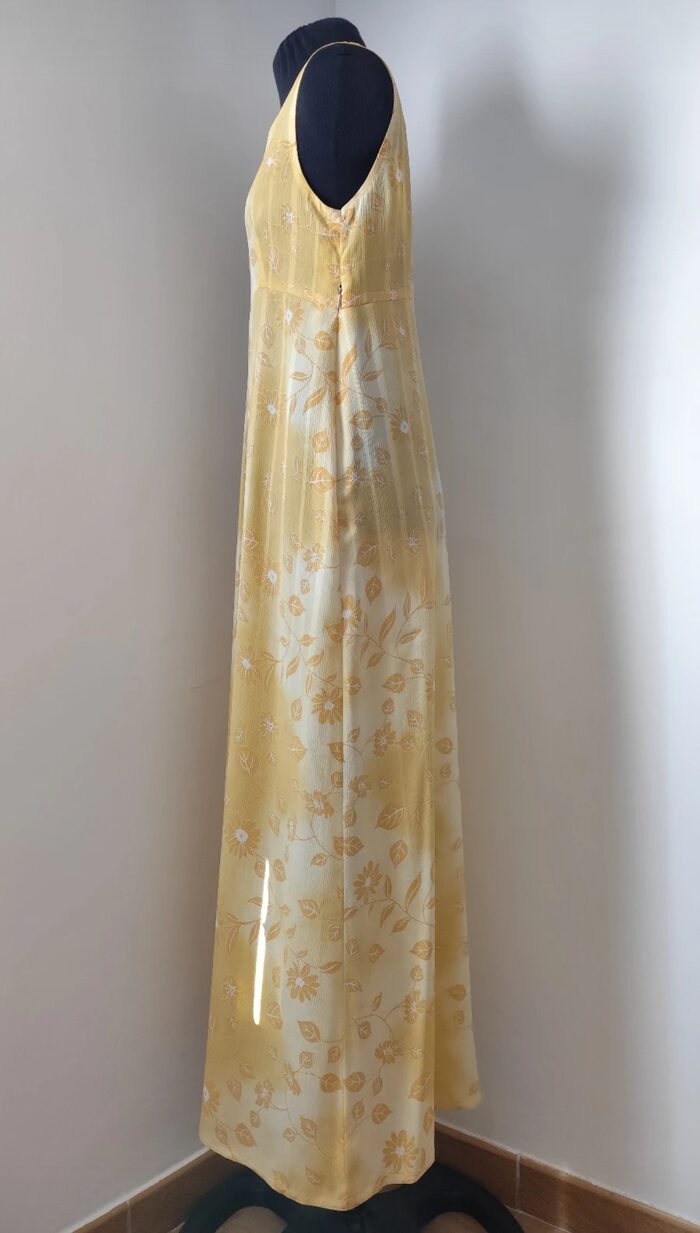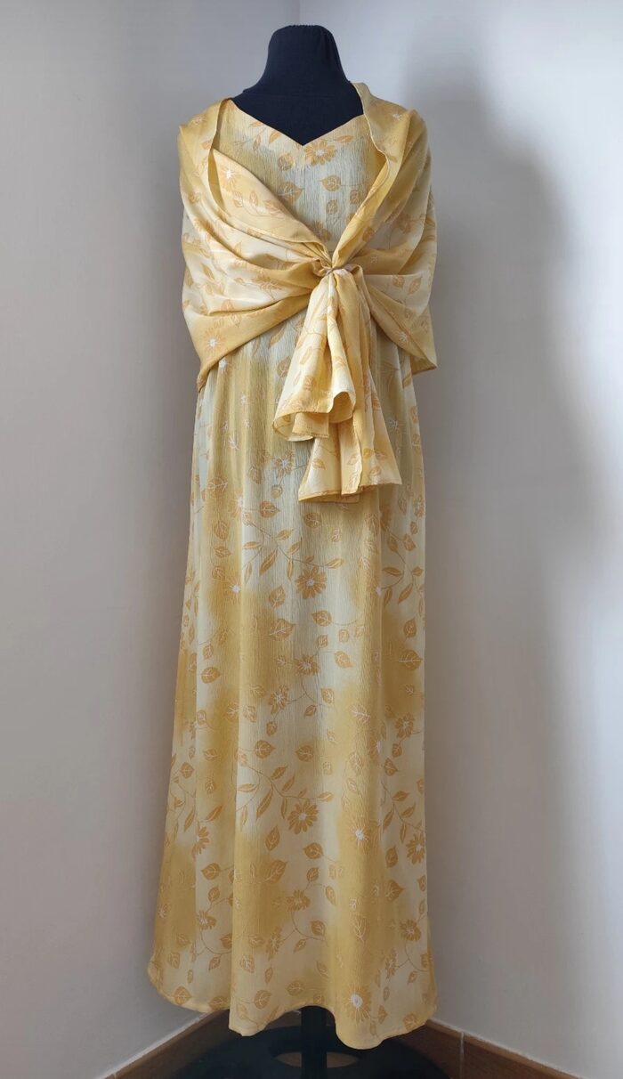 Abito lungo elegante, sartoriale, in tessuto leggero giallo sfumato con stampa floreale; modello stile impero senza maniche, scollo a V, taglio in vita e zip laterale invisibile. Rifinito in ogni dettaglio con grande precisione, insieme ha uno scialle dello stesso tessuto con anello. Realizzato a mano, in perfetto stato.