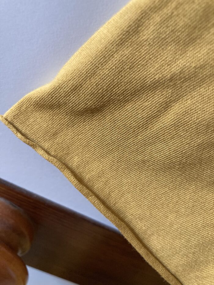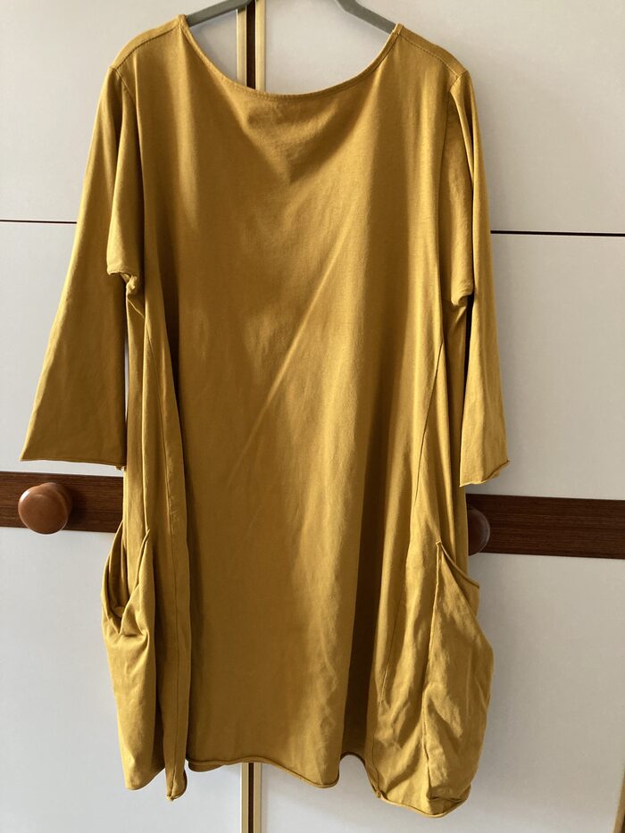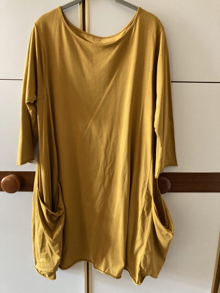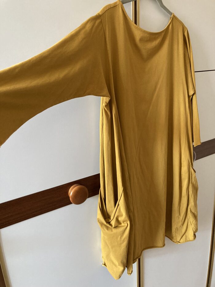 Color senape. L’etichetta è stata tagliata, ma credo sia cotone elasticizzato. Veste diverse taglie, data la forma molto ampia.Misure: spalle 40, ascelle 54, lunghezza 93.Orli a taglio vivo.Ha due tasconi sul fondo, laterali. .