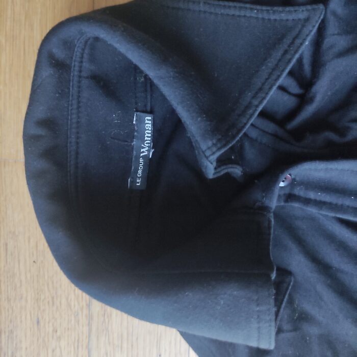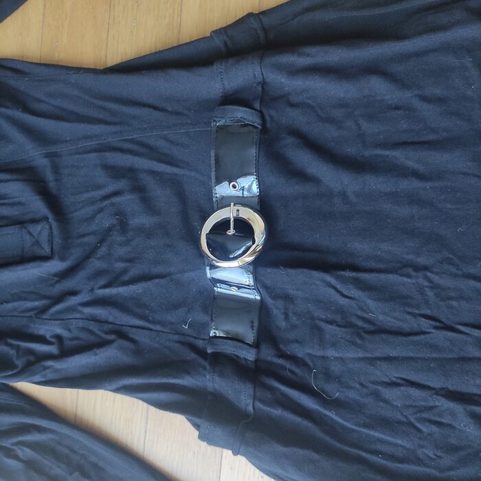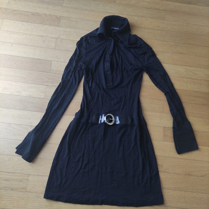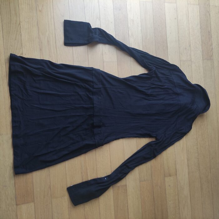 abito vestito nero, credo in viscosa di cotone, con finta xontura, sopra al ginocchio, veste taglia m .