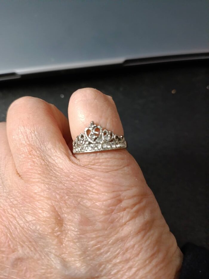 Anello in metallo (non so quale, non è argento) con brillantini e lavorazione tipo intreccio. Diametro interno circa 17 mm .