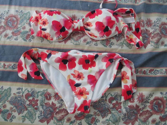 Bikini a sfondo bianco con fiori rossi.