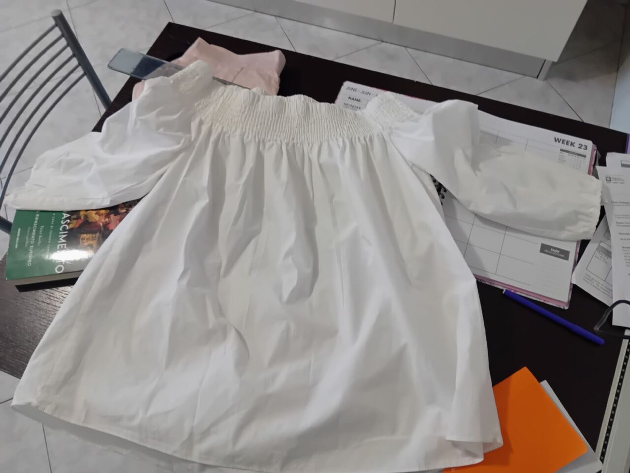 Prendo cose per altri ma non sempre ci azzecco. Molto bella e di puro cotone fragrante, fresco, estivo, ma decisamente grande per amica, è vero che indica taglia S ma secondo me ci vuole almeno una L, se no le spalle larghe cadono giù, e alle ascelle è larga 49 cm. È anche vero che sembra nuova, ma ha 3 o 4 macchiette, sulla cui smacchiabilità non so pronunciarmi, aggiungo foto. .