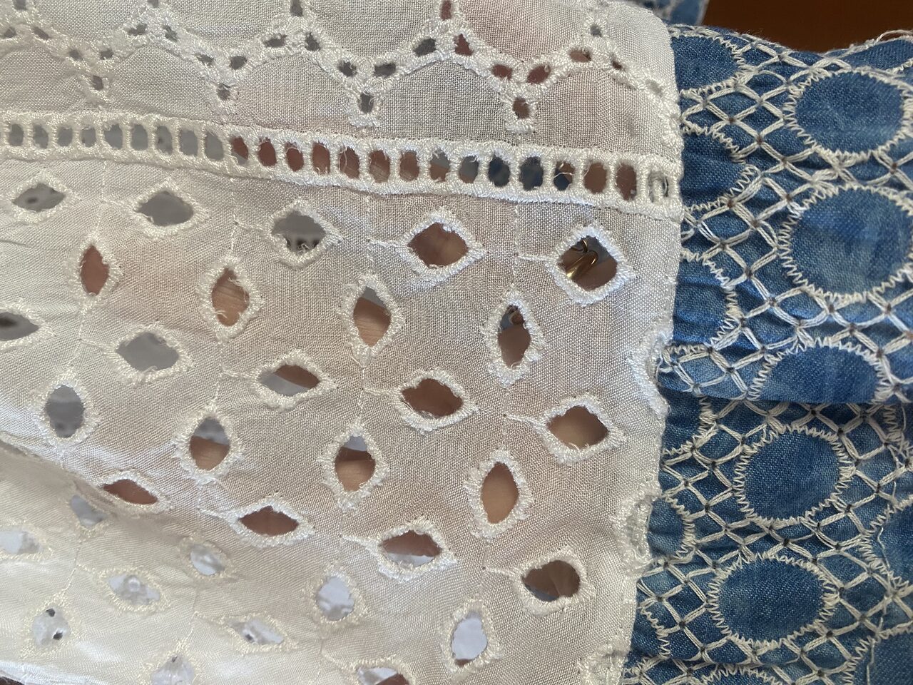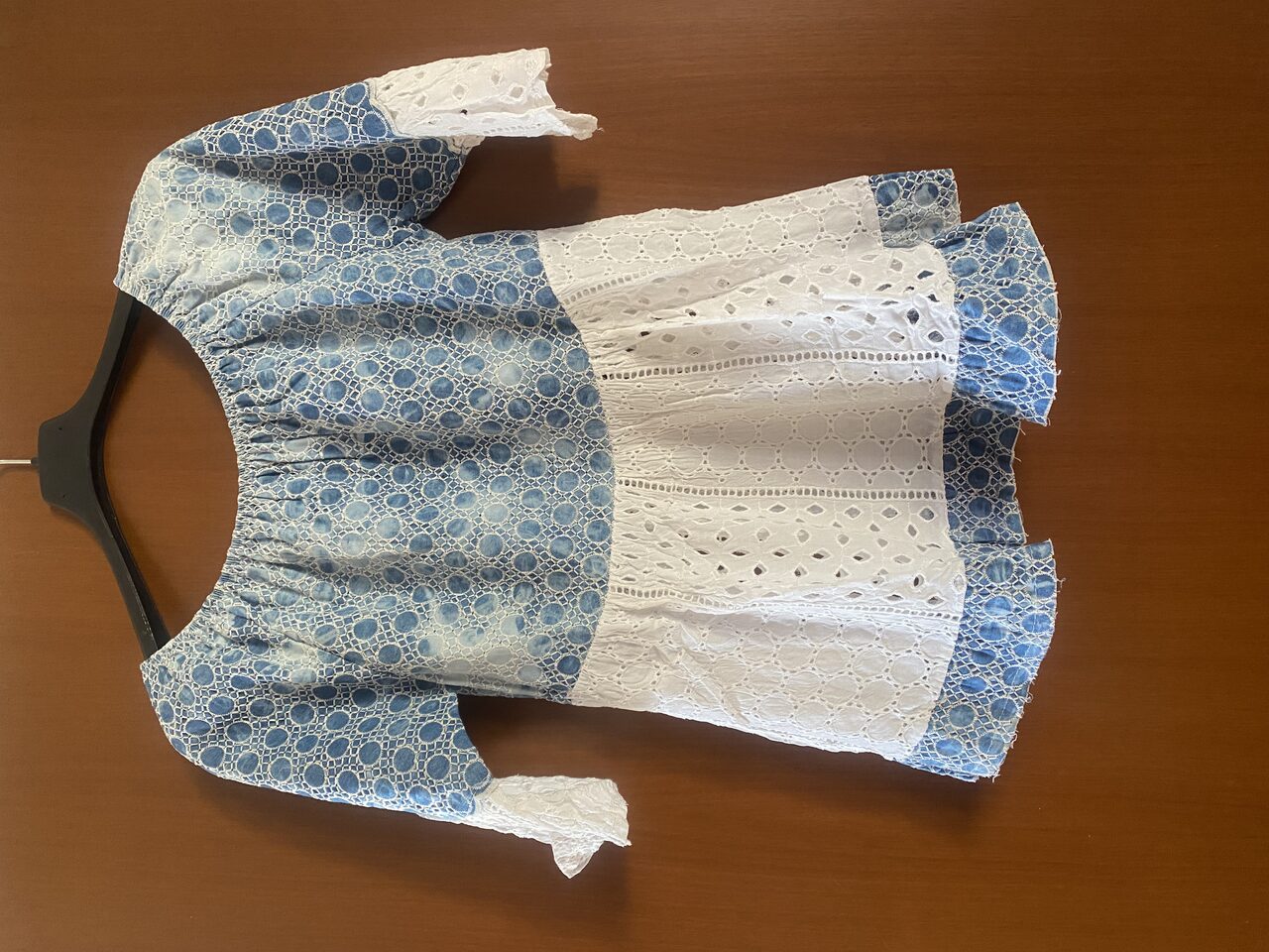 In cotone azzurro jeans delavé con ricamo e inserti in sangallo, molto graziosa. Veste una 44 .