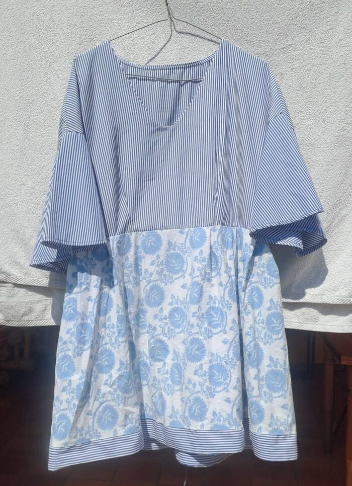 Blusa in cotone, veste taglia M/L, parte a righe, parte fantasia. Modifica su capo acquistato a cui è stata aggiunta la parte fantasia. .