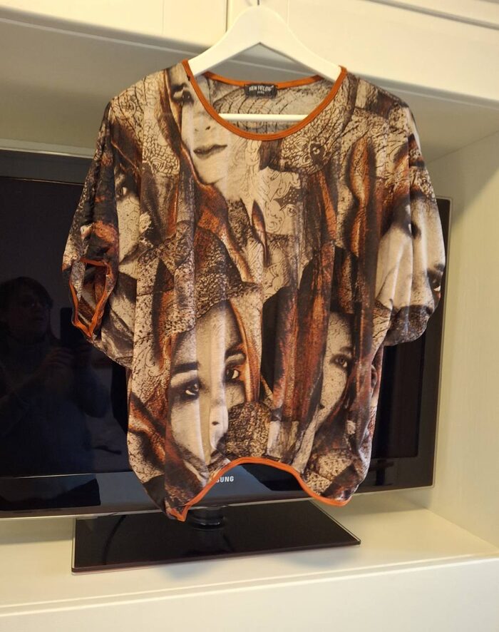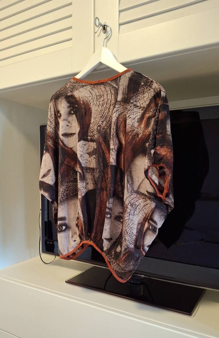 Blusa in ottime condizioni.Taglia unica, secondo me veste dalla S alla L.Composizione: 100% polyester. .