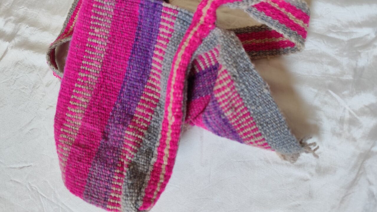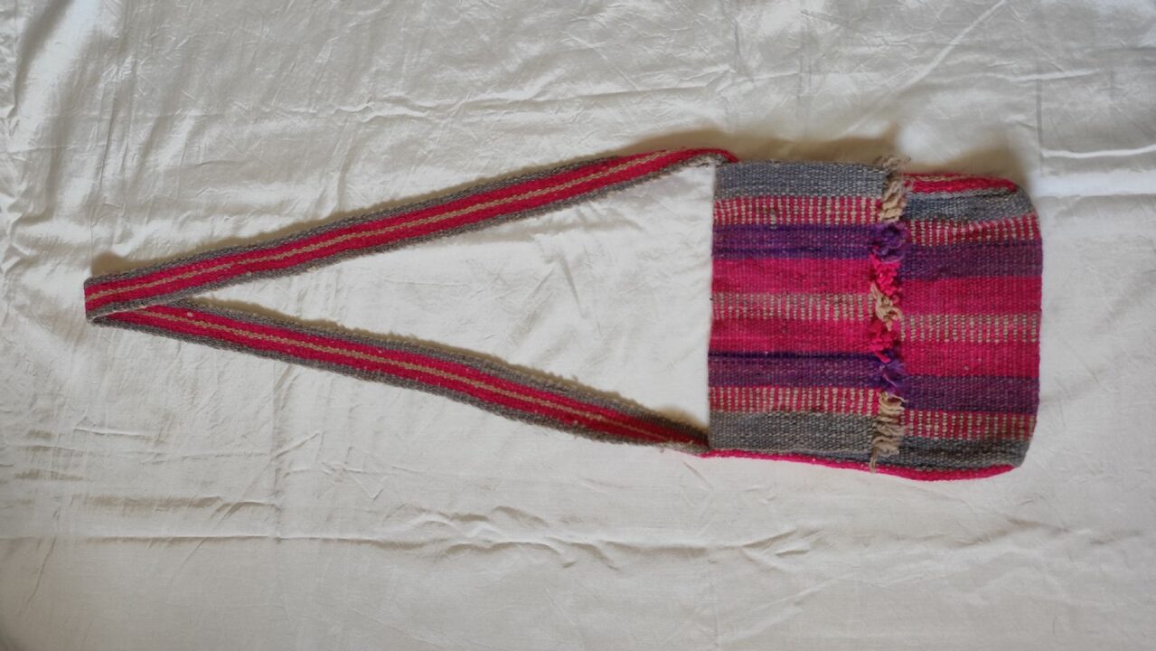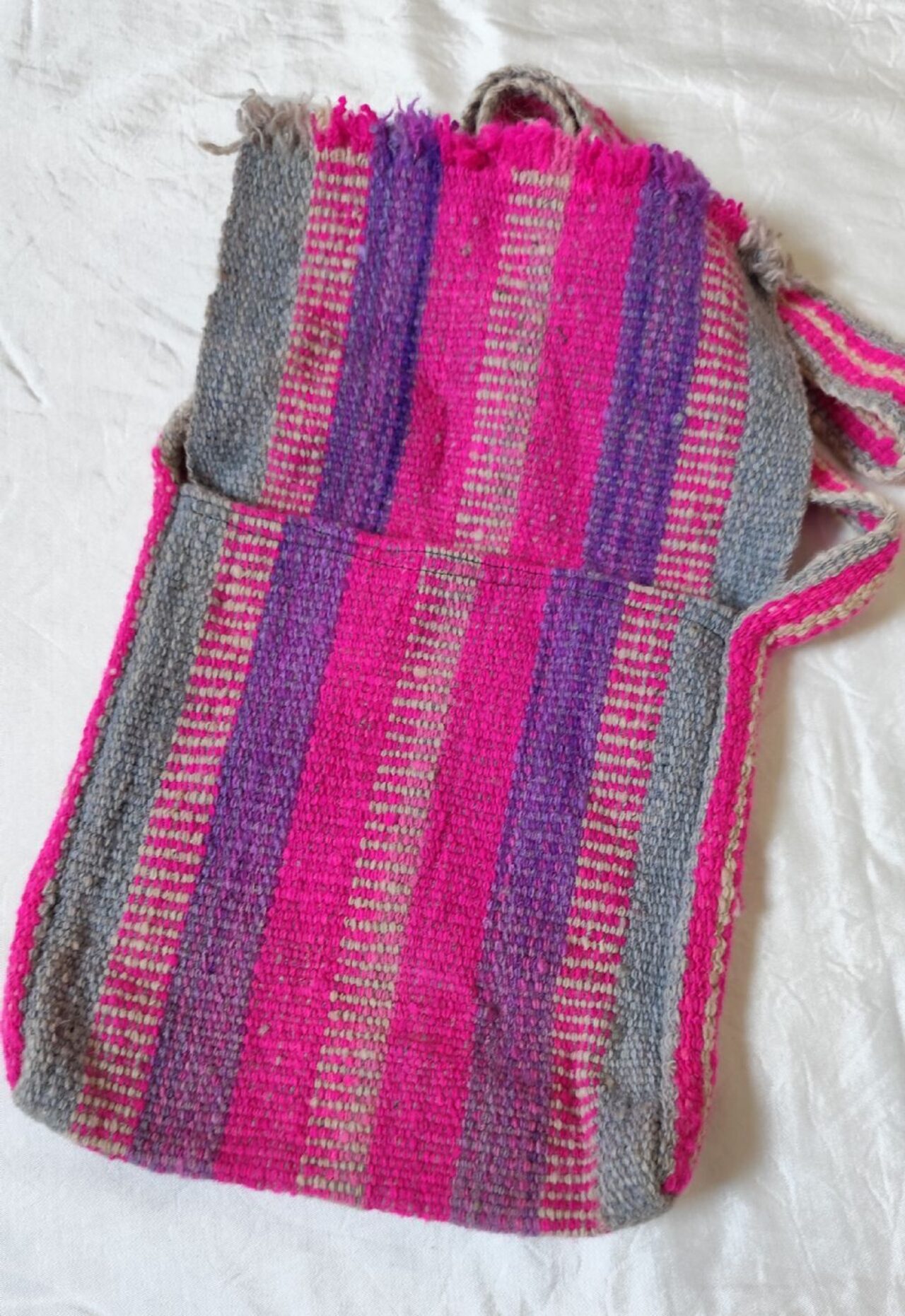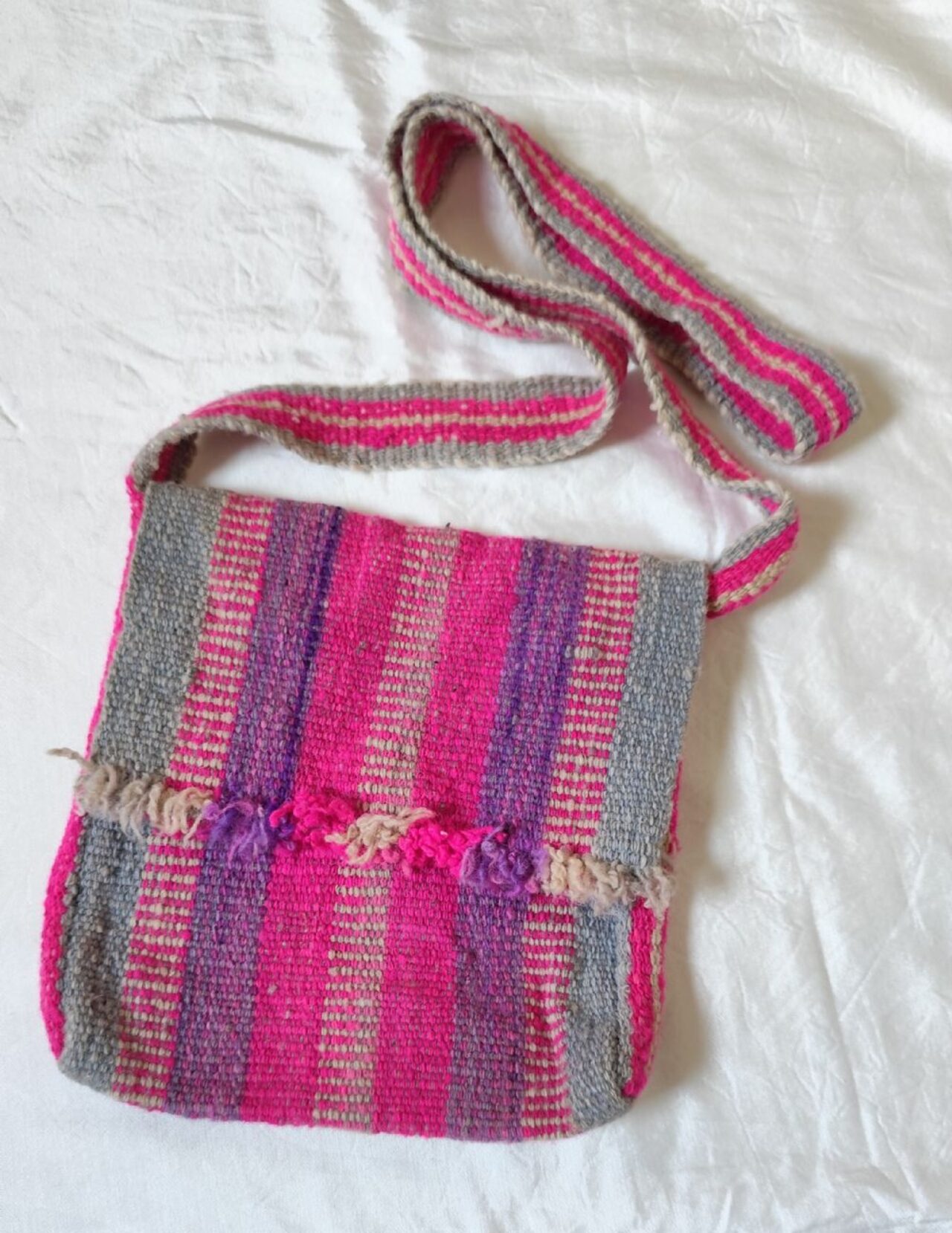 Borsa a tracolla vintage rosa e verde, multicolore, in stile etnico, fatta a mano probabilmente in lana. Modello molto semplice a sacchetto senza chiusura, ha solo pattina con frangia.In ottimo stato, non presenta difetti. Non ha etichette.Misura cm 23x23, tracolla cm 125. .