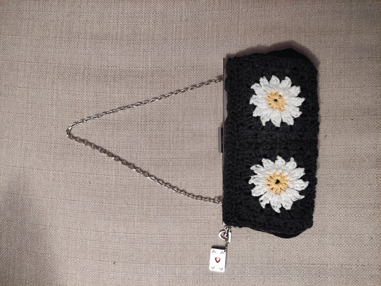 Piccola borsa presa qui e ricreata con rivestimento all''uncinetto. Catenella e pendenti in metallo. Pari al nuovo .