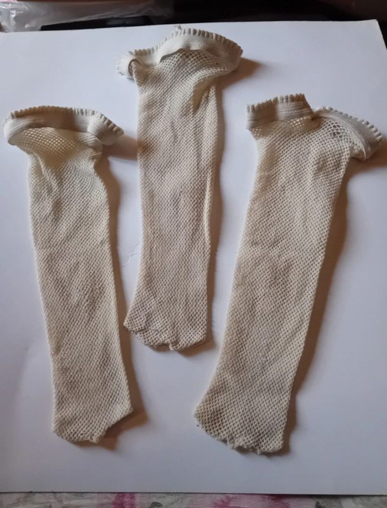 O gambaletti corti (lunghezza sopra caviglia, coprono la caviglia). Un paio + 1 di scorta. Vintage, di ottima qualità, in buono stato: la rete si è allargata in alcuni punti, essenzialmente sotto la pianta (la 3a foto spiega quello che si intuisce nella 2a), ma sono integri, senza buchi o strappi o altro. Probabilmente erano taglia unica, ma usati da un 37 e quindi adatti a un 37. .