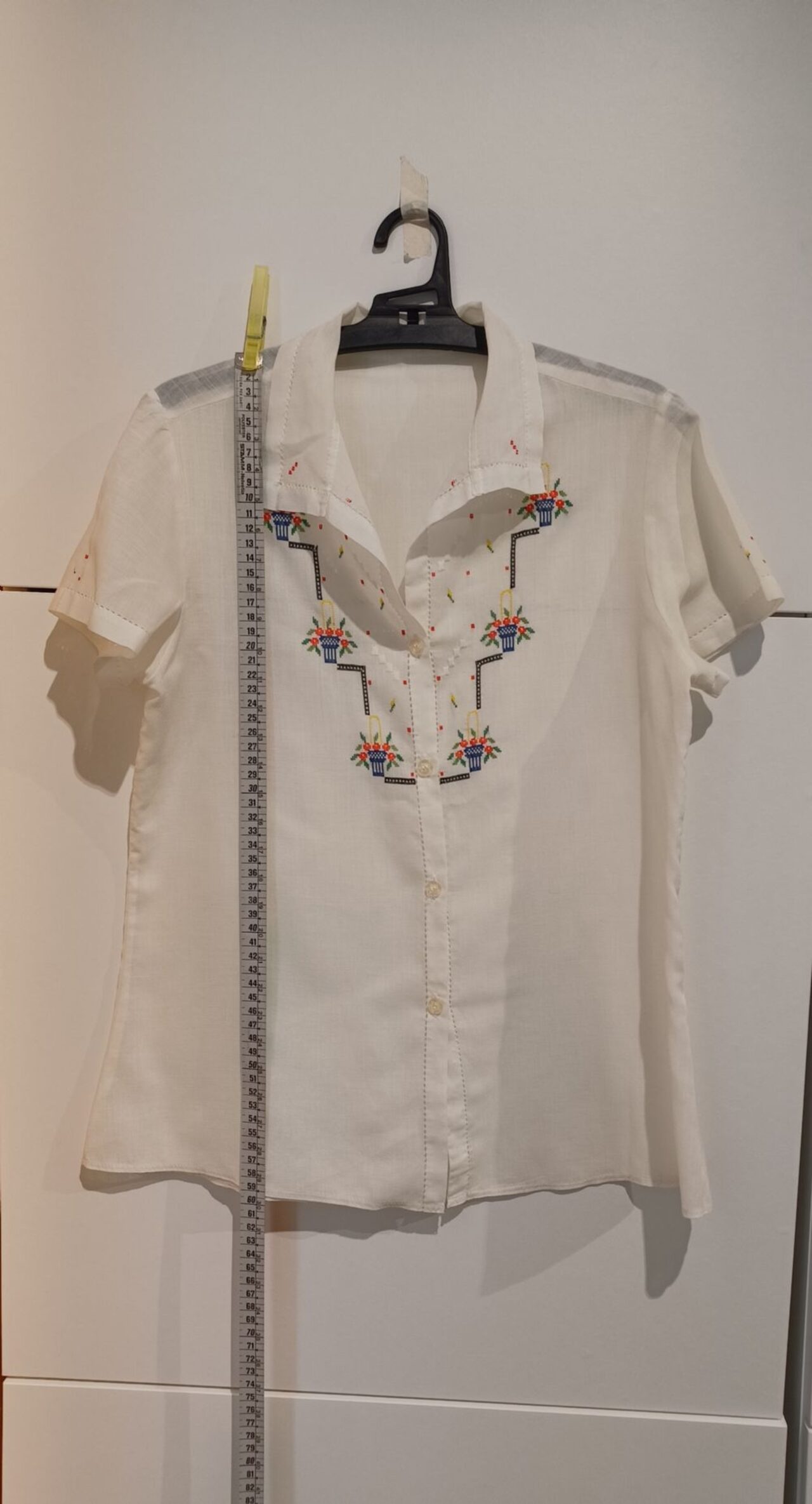 Camicetta bianca ricamata TG. M. Misure in foto. Non ha etichetta ma direi misto cotone. Ben tenuta. Consegna a mano o collettiva Varese. .