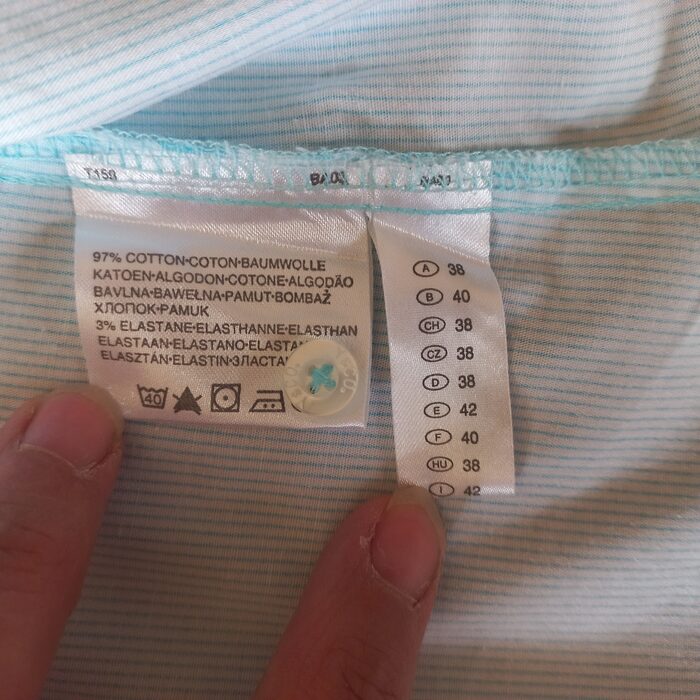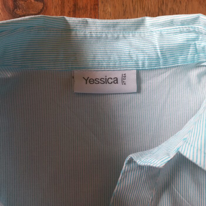 Camicia taglia 42, composizione 97% cotone 3% elastan, azzurra a righine sottili.