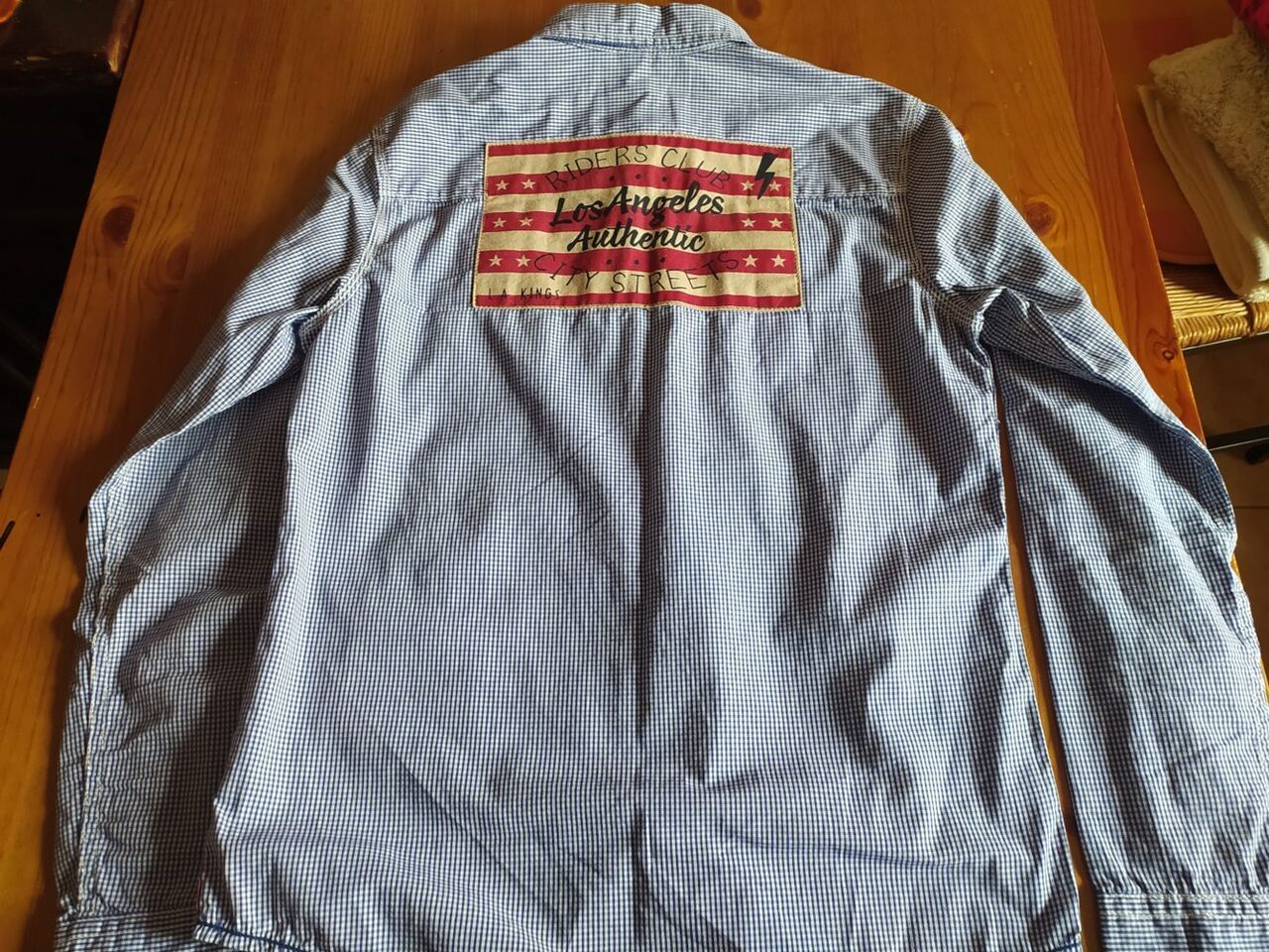 Camicia a quadretti bianco/blu particolare senza etichetta composizione, credo cotone, con disegno sul retro, spalle cm 40, ascelle cm 46, lunghezza cm 63. .
