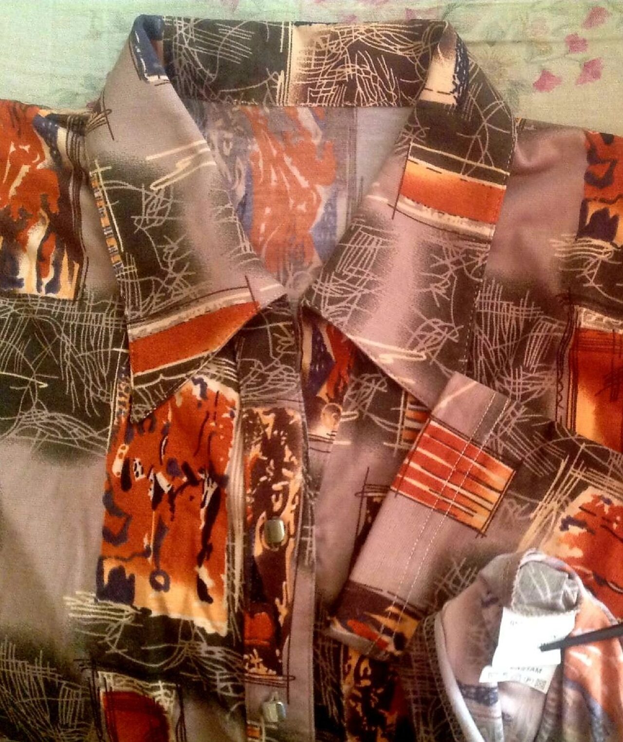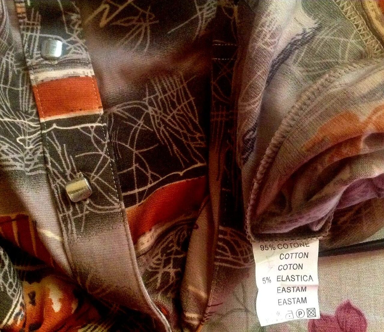 Camicia di mia zia, vintage o quasi, ma credo mai usata, nuova. Jersey di 95% cotone 5% elastica, tg non pervenuta, metto XL ma non lo so, fate riferimento alle misure: spalle 45 e ascelle 54 cm. Bottoni quadrotti di metallo, spalline (volendo scucibili). Ai polsi è come una maglia, senza bottoni. .