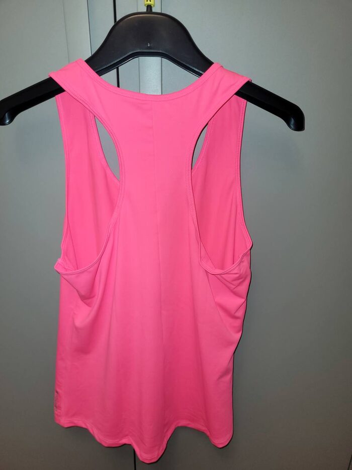Canotta rosa fluo Domyos (Decathlon) tg. S.In poliestere elasticizzato.Misure: petto 40 cm, lunghezza 60 cm. .