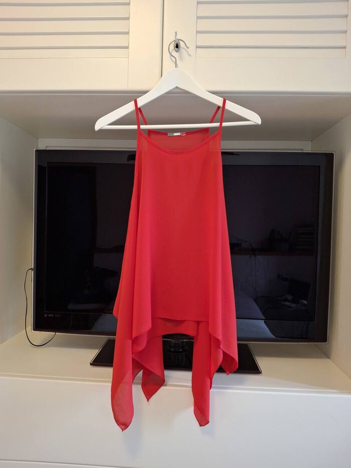 Bella canotta estiva dal taglio asimmetrico, tessuto leggero 100% polyester.