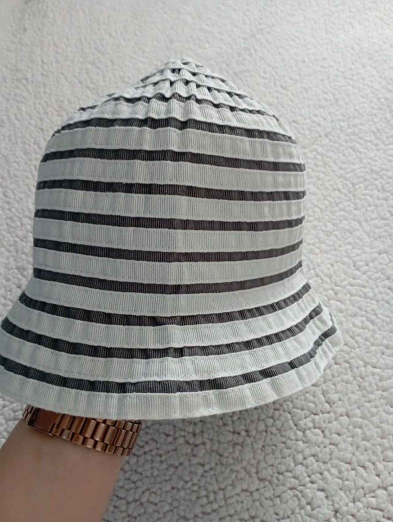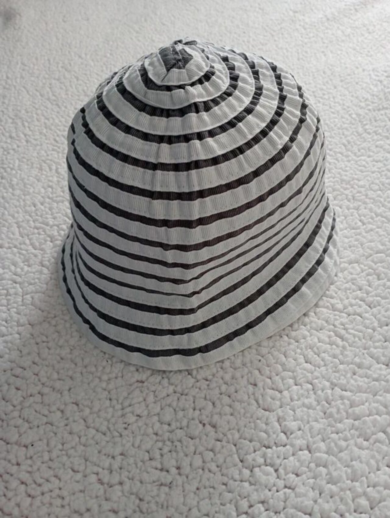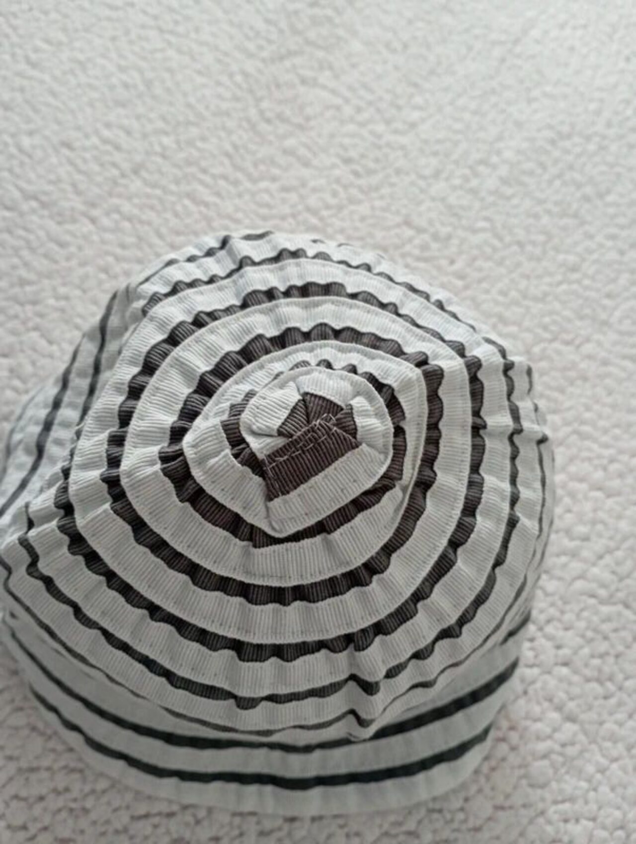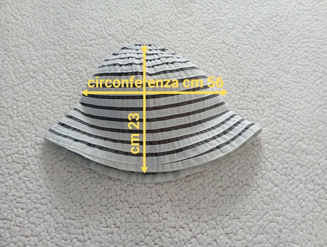 Cappello alla pescatora cucito con nastro gros grain bianco e grigio alternato.Non ha etichetta composizione ma dovrebbe essere in cotone.Molto carino e versatile, non ha difetti particolari, lo spedisco piegato.Misure: circonferenza cm 56. (Vedi schema misure in foto) .