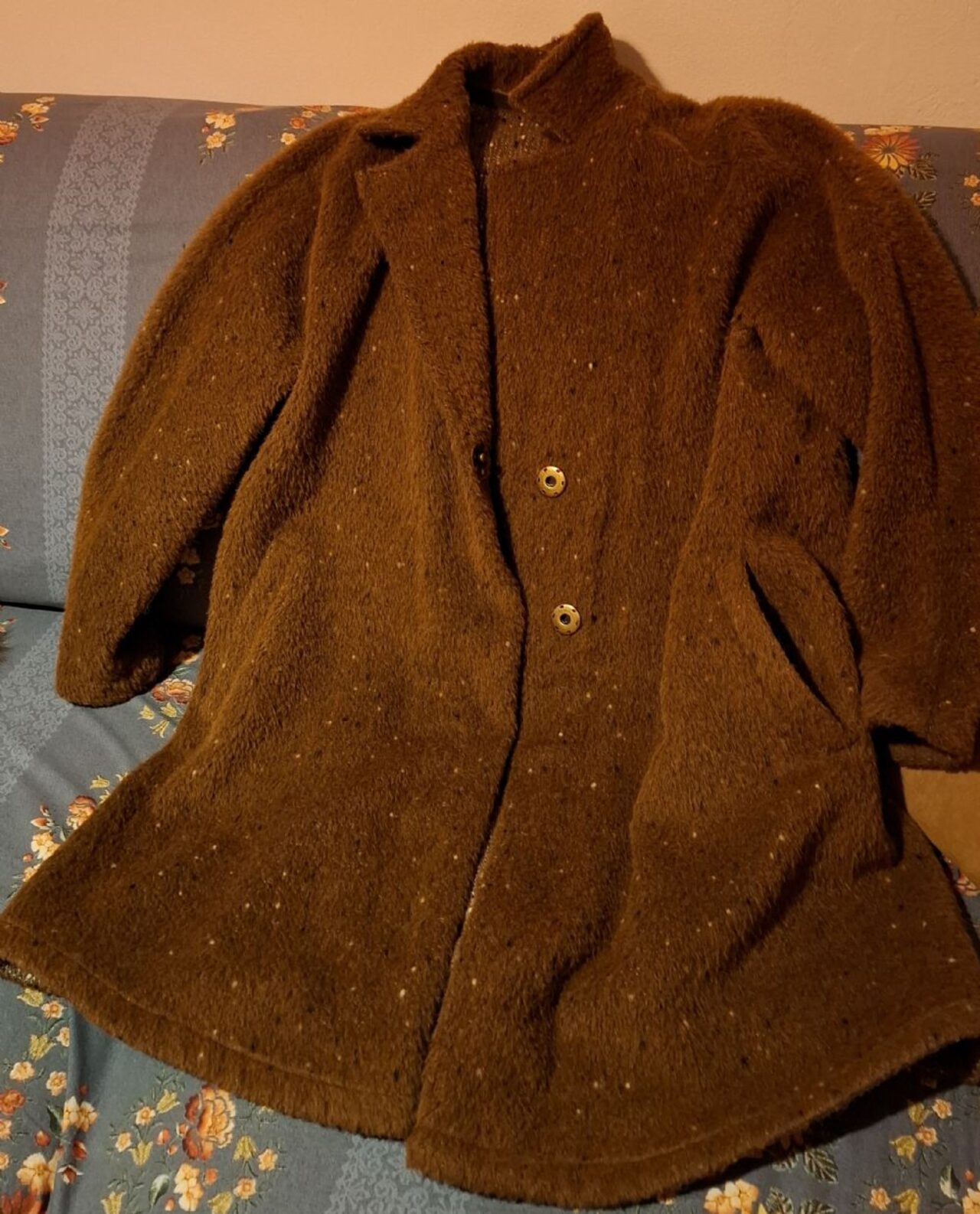 Non ha più etichette perché è stato riadattato dalla sarta (aveva i bordi di pelliccia e la cintura, dice la suocera), ma mi è stato assicurato che sia comunque lana e di marca, vado sulla fiducia, spero anche voi. ;)L''ho indossato io che sono una M (42/44) e mi va grandino, direi L quindi.Ha due bottoni a pressione e due tasche, stoffa molto bella, le foto fanno un po'' schifo e non rendono... (colore non così caldo e acceso come si vede nella prima foto). .