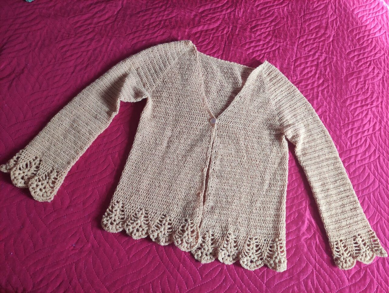 Cardigan fatto a mano all'' uncinetto, in lana giallo ocra o senape (il colore è come quello delle ultime foto), chiuso con 1 bottone, veste taglia m 42 44 .