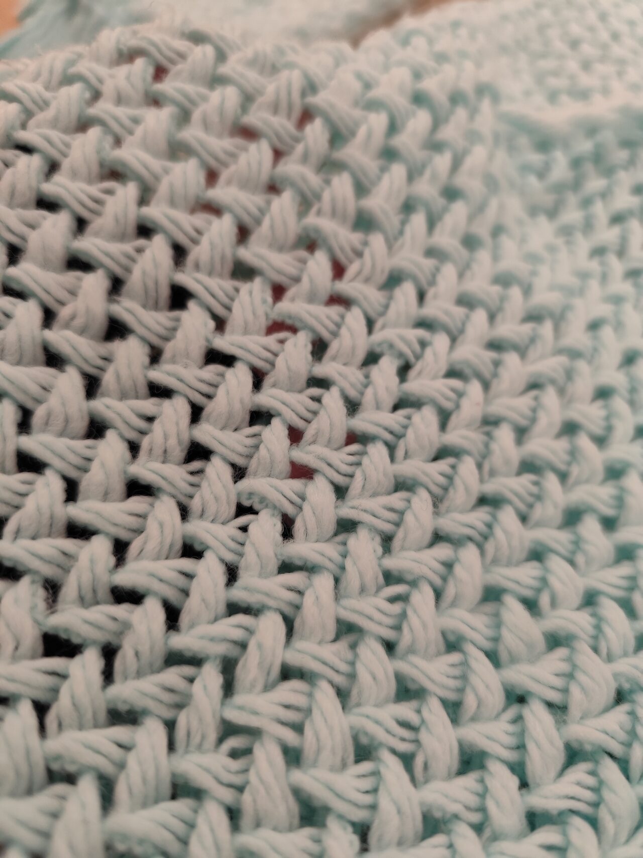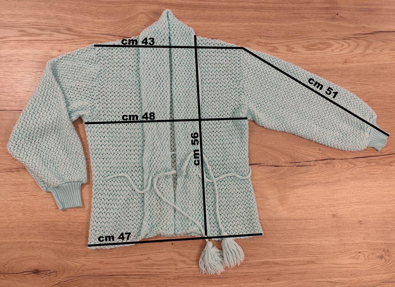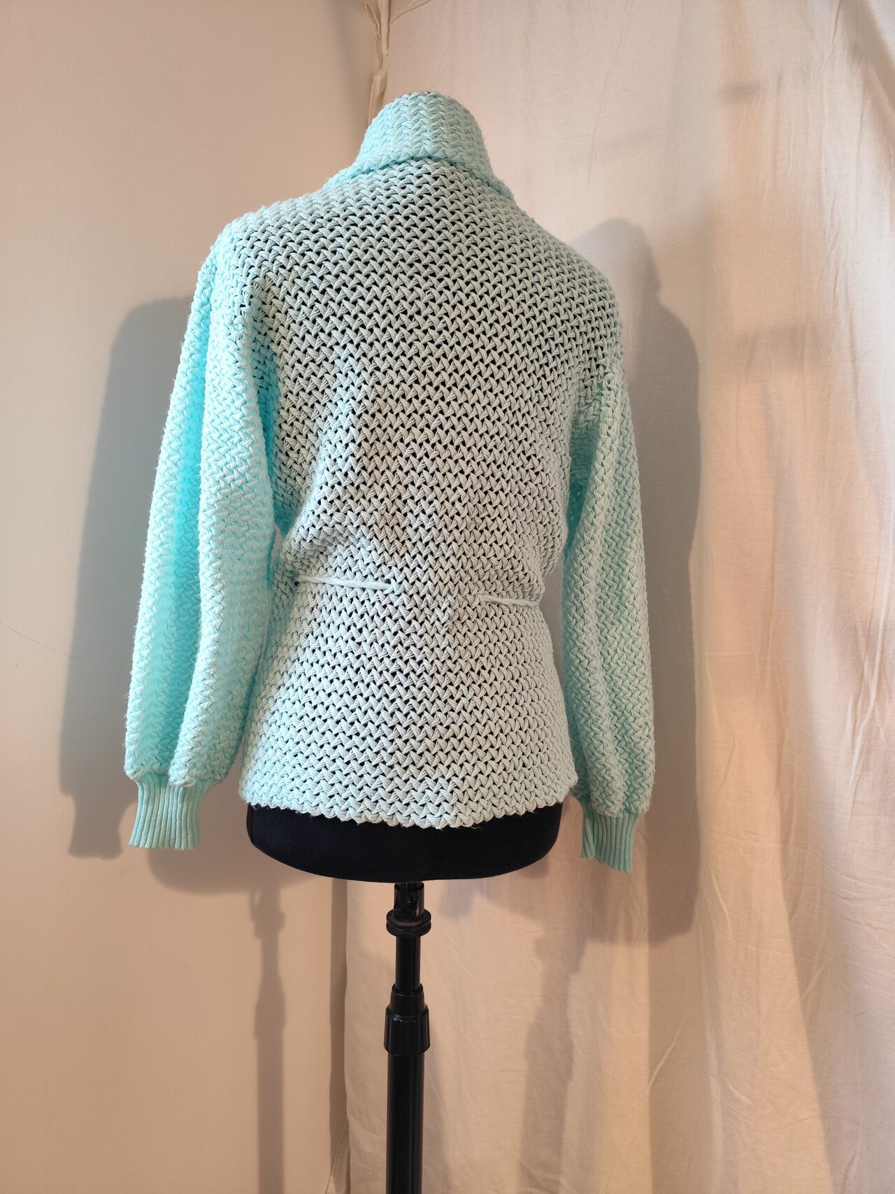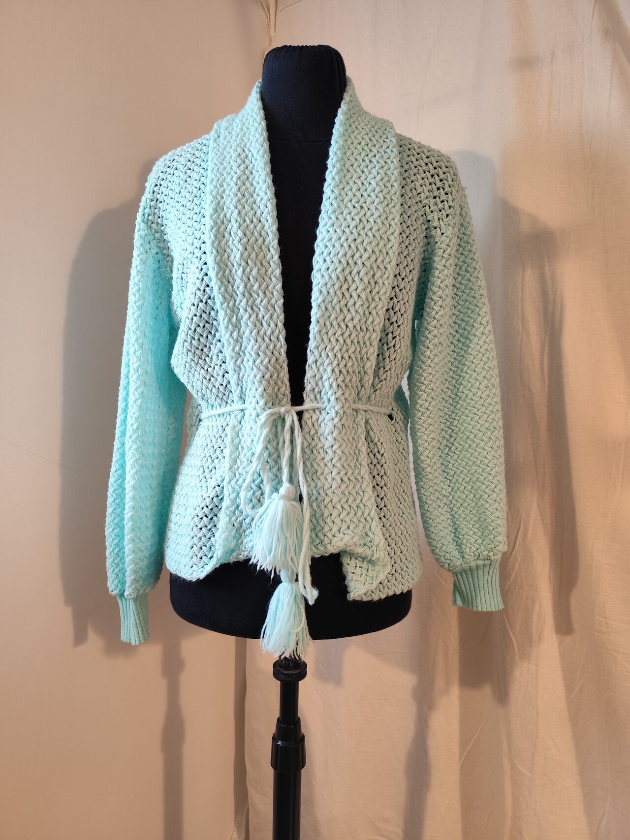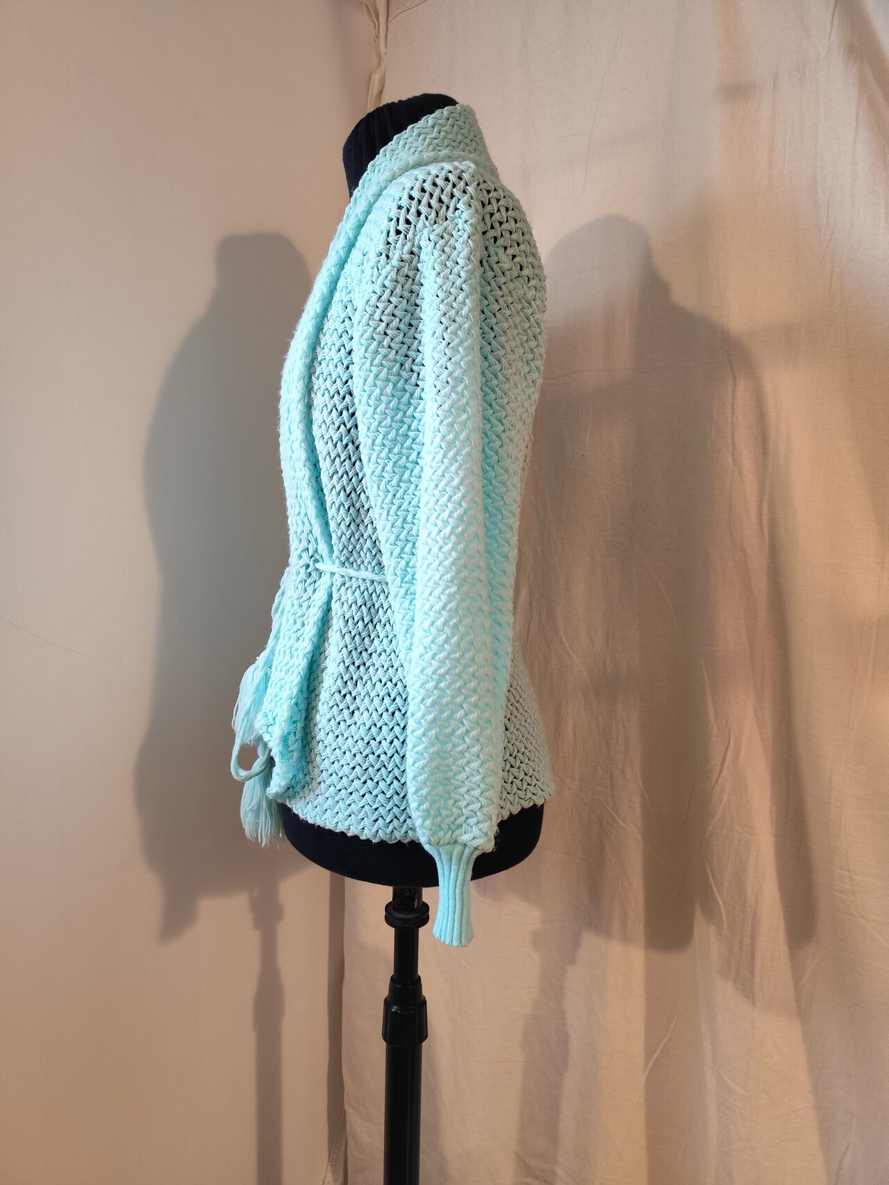 Cardigan in maglia color verde acqua. Modello corto con cordoncino in vita, maniche lunghe ampie e collo a scialle. Molto morbido, ha una lavorazione traforata, in perfetto stato senza difetti.
