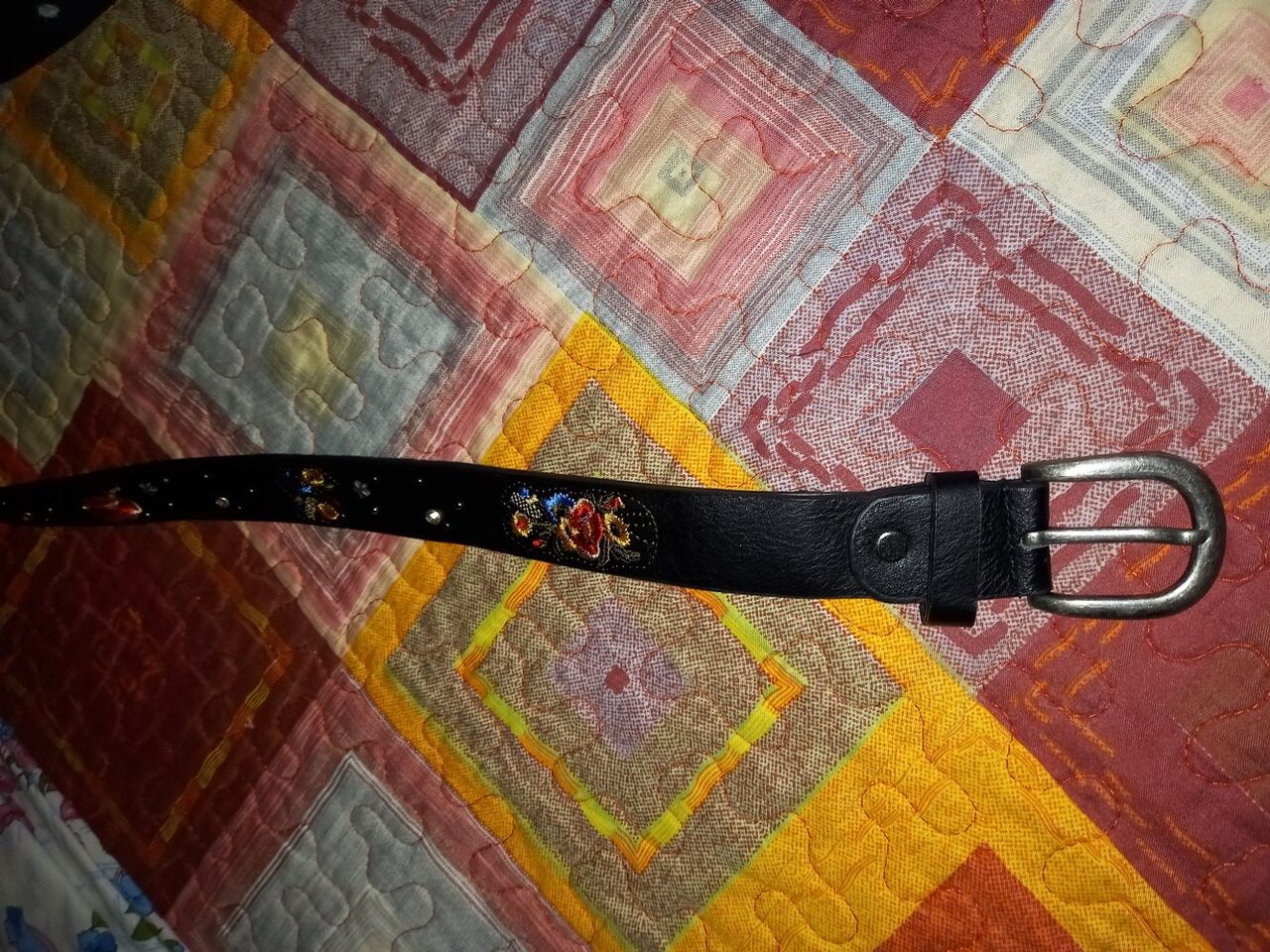 Cintura cuoio con ricami,borchiette,stelline in metallo e perline, è stato fatto un buco in più su un ricamo ( seconda foto).ma non è mai stata usata. Lunghezza totale cm 103 larghezza 3cm .