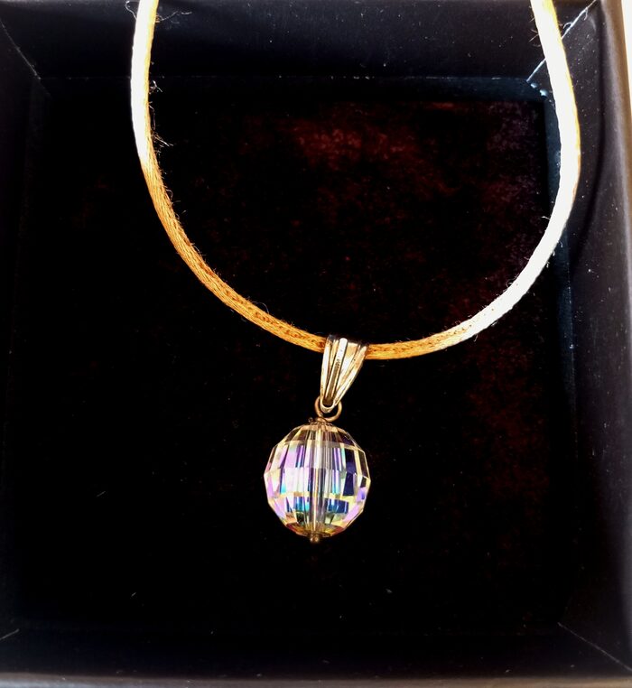 Collana in raso con rifiniture in argento e ciondolo in cristallo sfaccettato