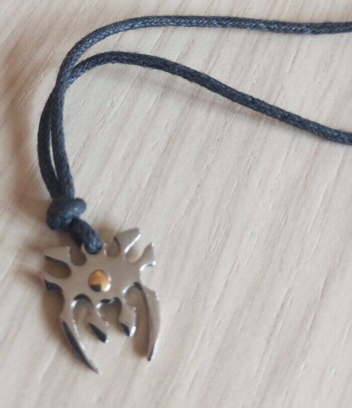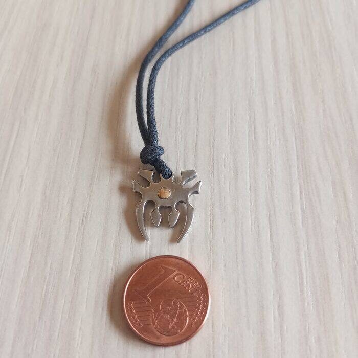 Collana con cordoncino nero regolabile e ciondolo tribale in acciaio con puntina dorata.