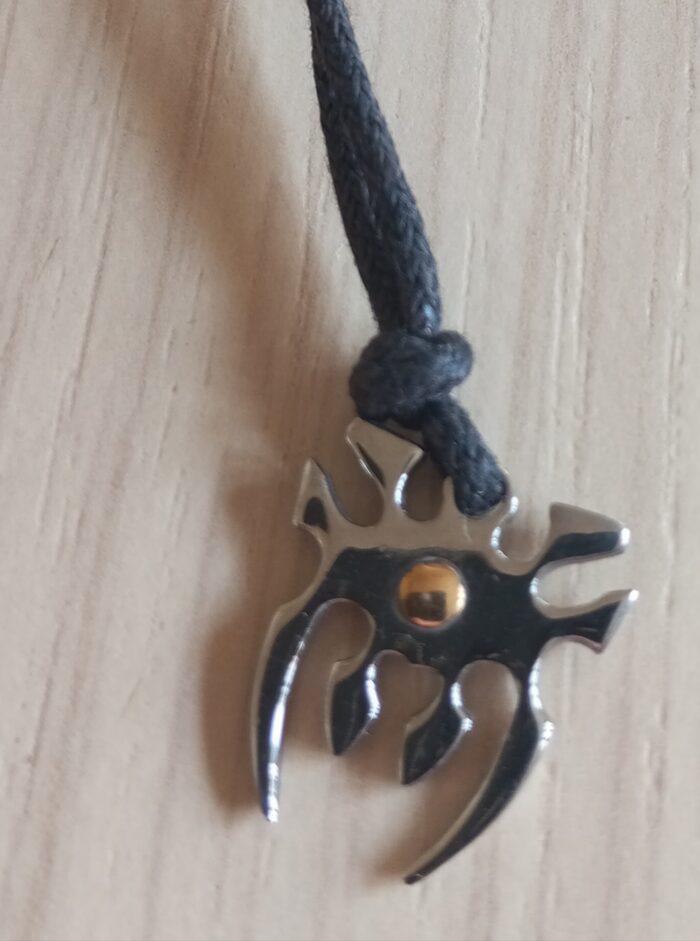 Collana con cordoncino nero regolabile e ciondolo tribale in acciaio con puntina dorata.