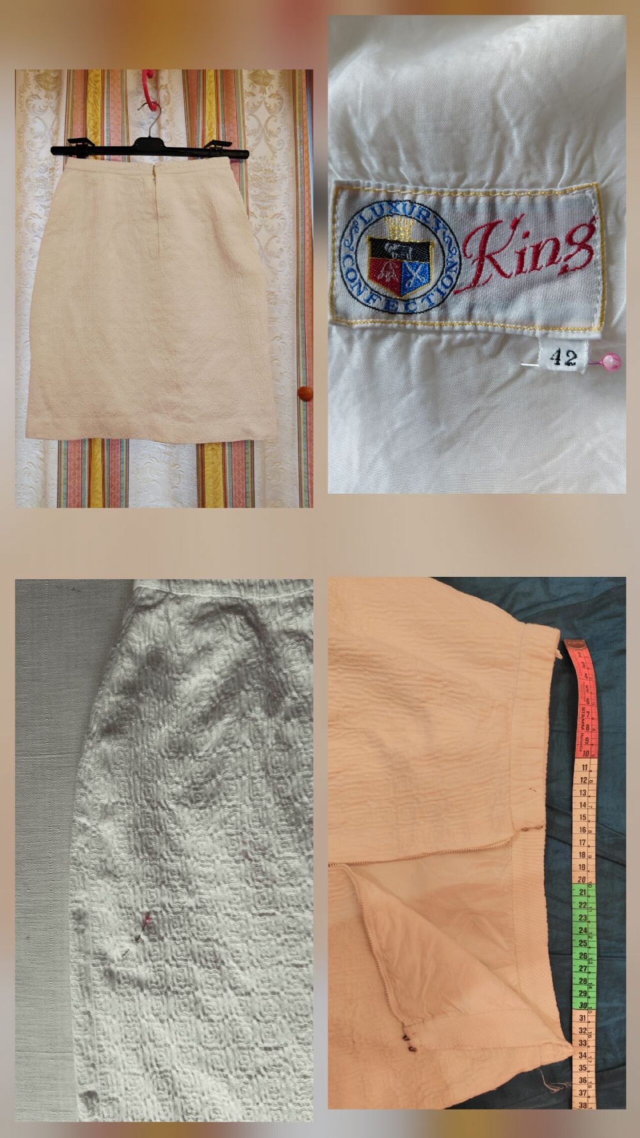 Completo donna tg.42 giacchina manica 3/4 e gonna. Ho messo usato tanto perché datato, di quei capi che si facevano una volta. Curato nei dettagli, ma da troppi anni nell'' armadio e ho bisogno di fare spazio. Ho riattaccato il fiocchetto alla giacchina affinché questo annuncio fosse completo, ma la portavo senza per dare un taglio più moderno. Perfetta sul jeans. Da rinfrescare, la gonna ha un leggero alone che segnalo con uno spillo, vedi foto dedicata. Non c é l etichetta della composizione ma direi cotone o piquet, il tutto completamente foderato. Volendo allungare la gonna restano ancora un paio di cm di orlo. Misure in foto. Consegna a mano o collettiva Varese. .