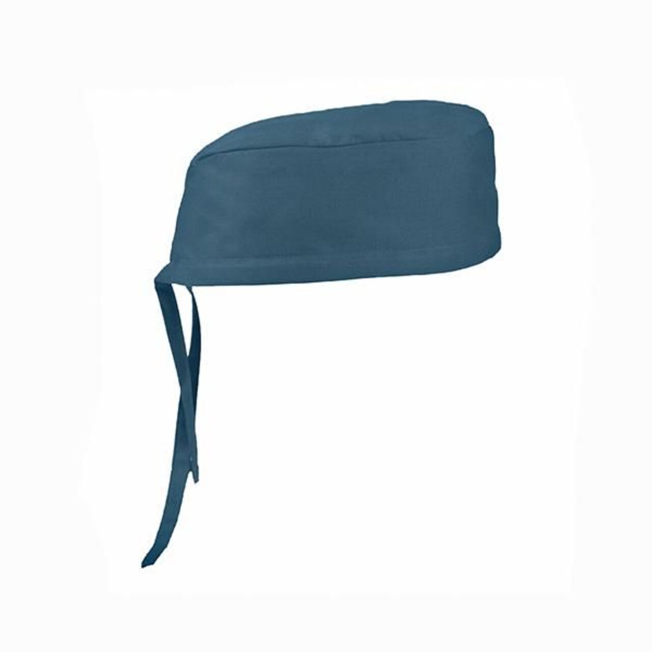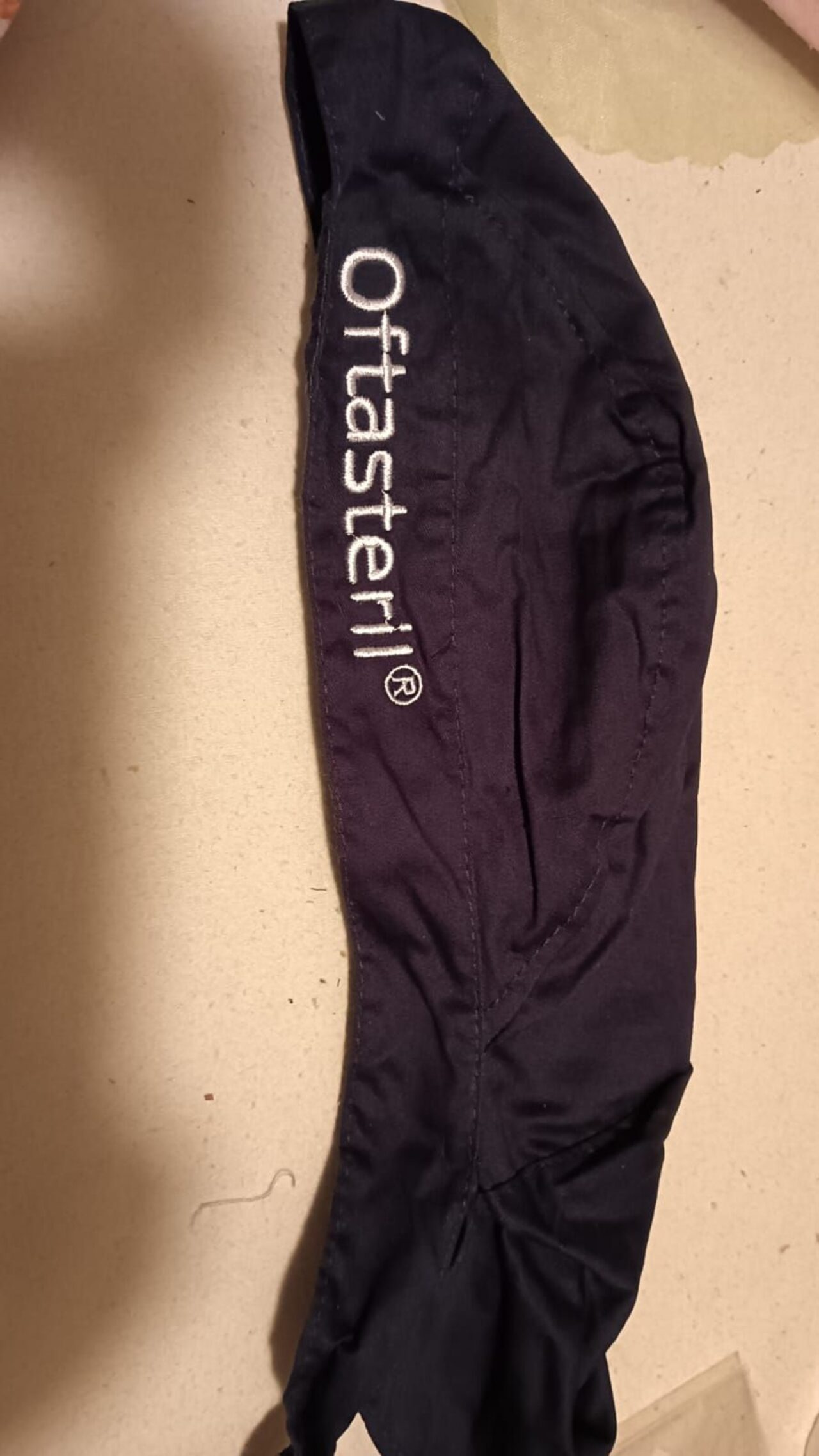 copricapo tipo sala operatoria in cotone blu con logo,nuovo ma spiegazzato .