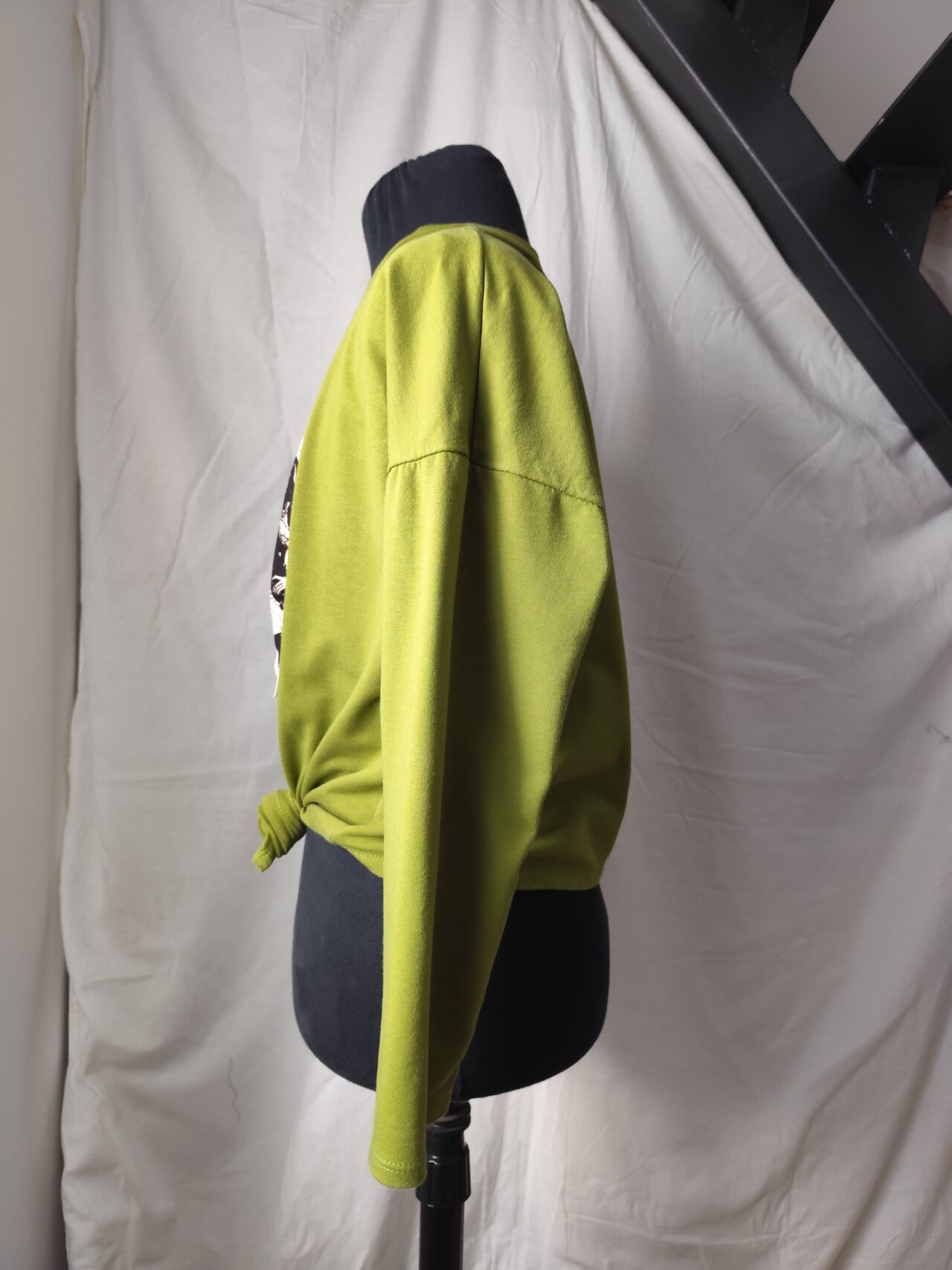 Felpa leggera in cotone garzato, colore verde acido con stampa applicata. Modello ampio, con nodo davanti, spalla scesa ampia e manica lunga, comoda e versatile per un look sportivo casual.