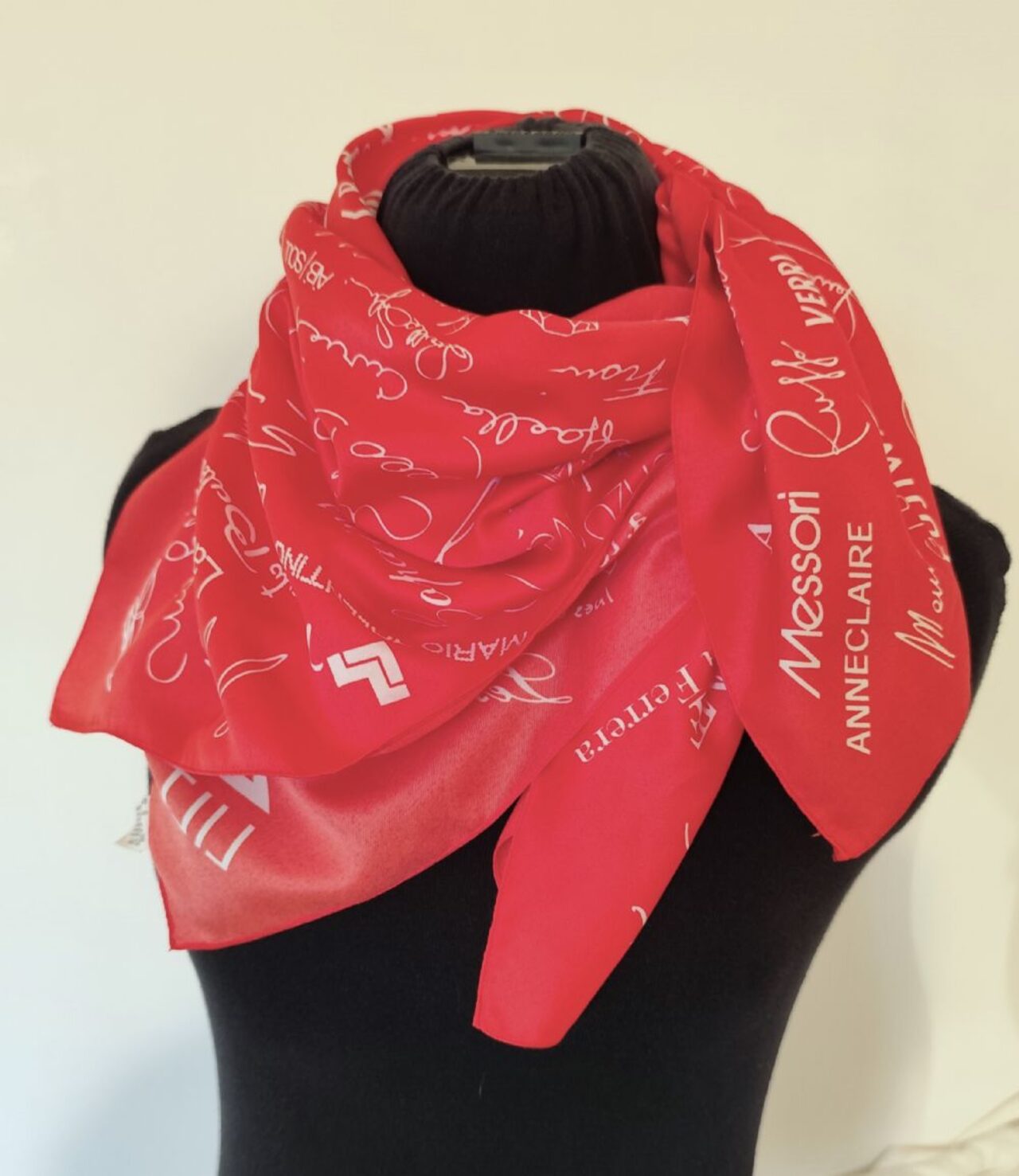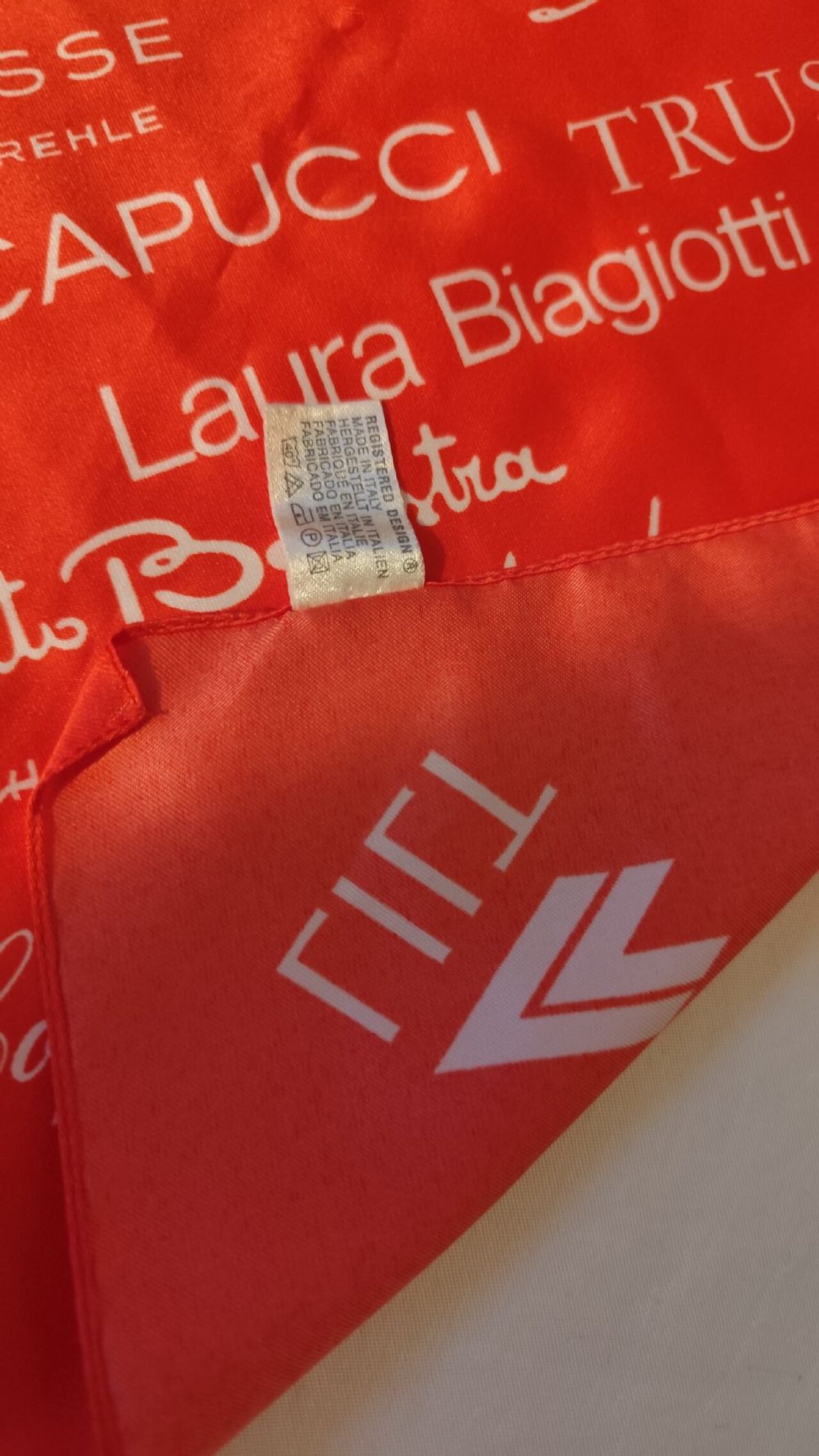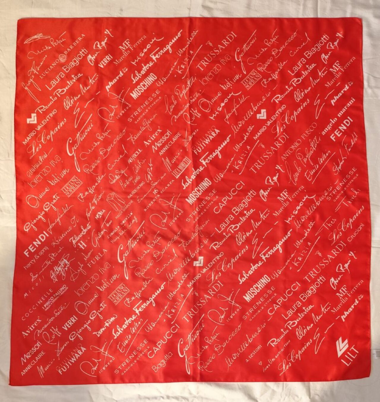 Foulard quadrato, in raso sintetico, con stampa di marchi famosi, colore rosso chiaro, più simile alla prima foto.Tessuto in raso sintetico 100%poliestere.Misura cm 78x81. .