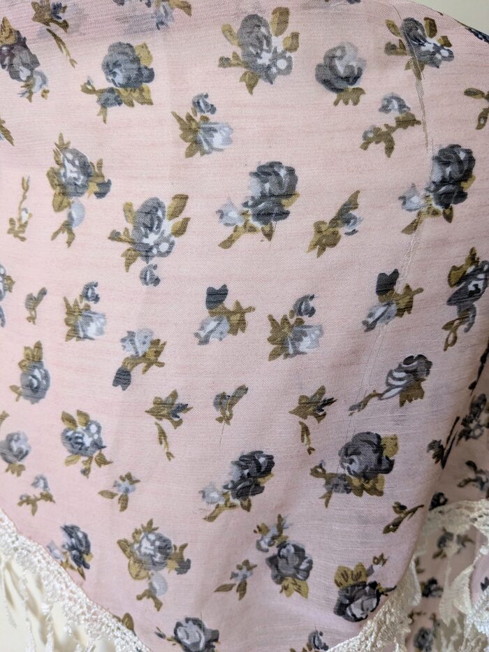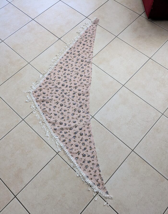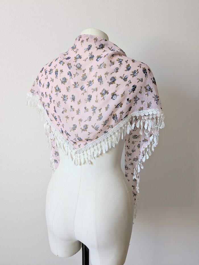 Foulard di forma triangolare in tessuto di poliestere leggero e semi trasparente, con frangette bianche. Il lato lungo misura cm 158. Fondo rosa con motivo a rose blu. Nuovo, mai usato .