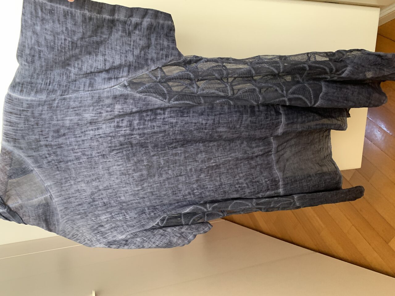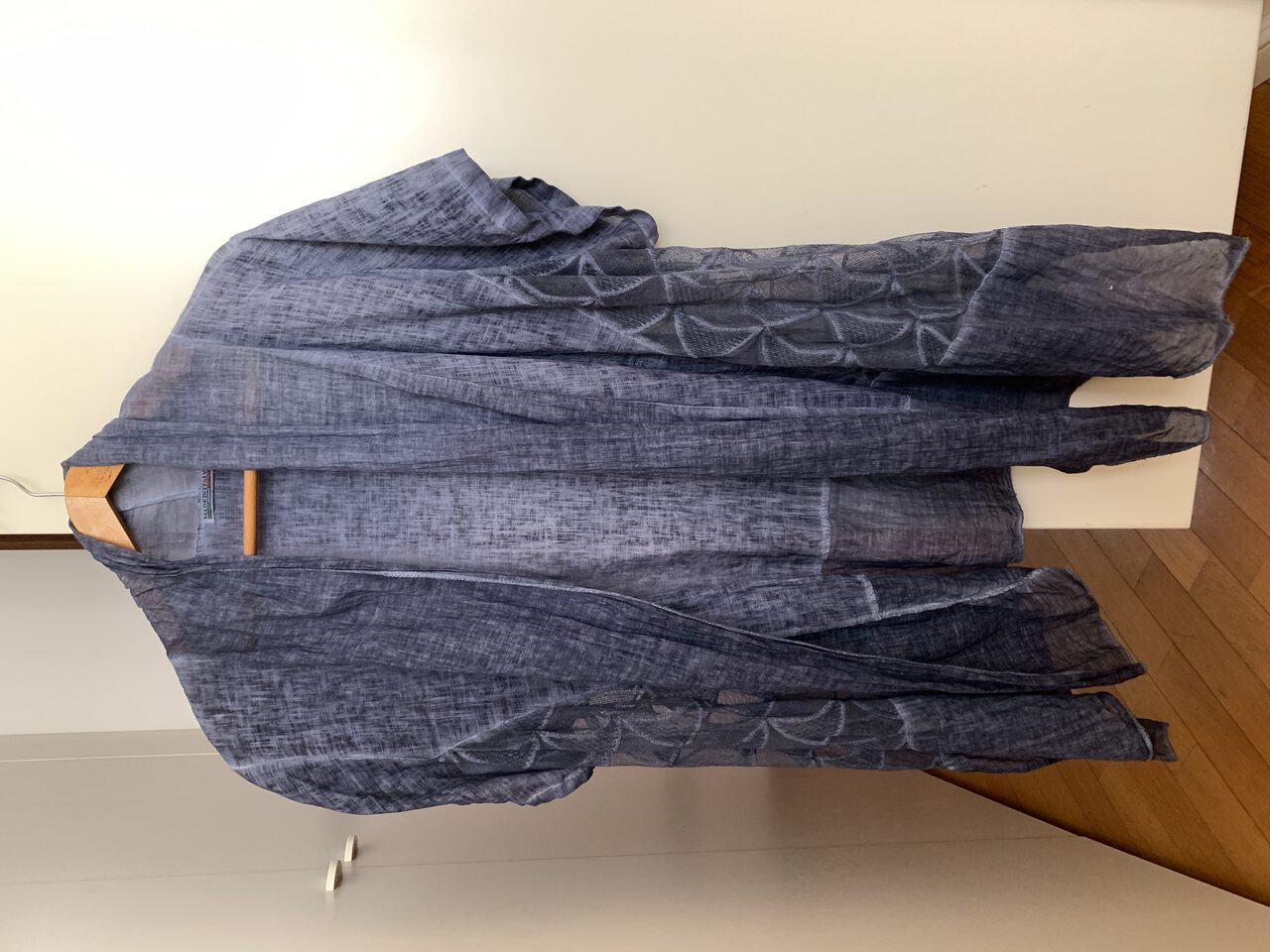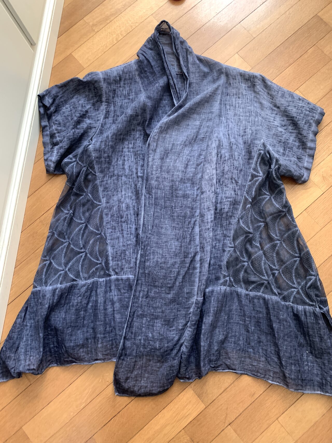 Ampia, assolutamente una taglia unica: non ha un’abbottonatura sì può portare come si vuole.