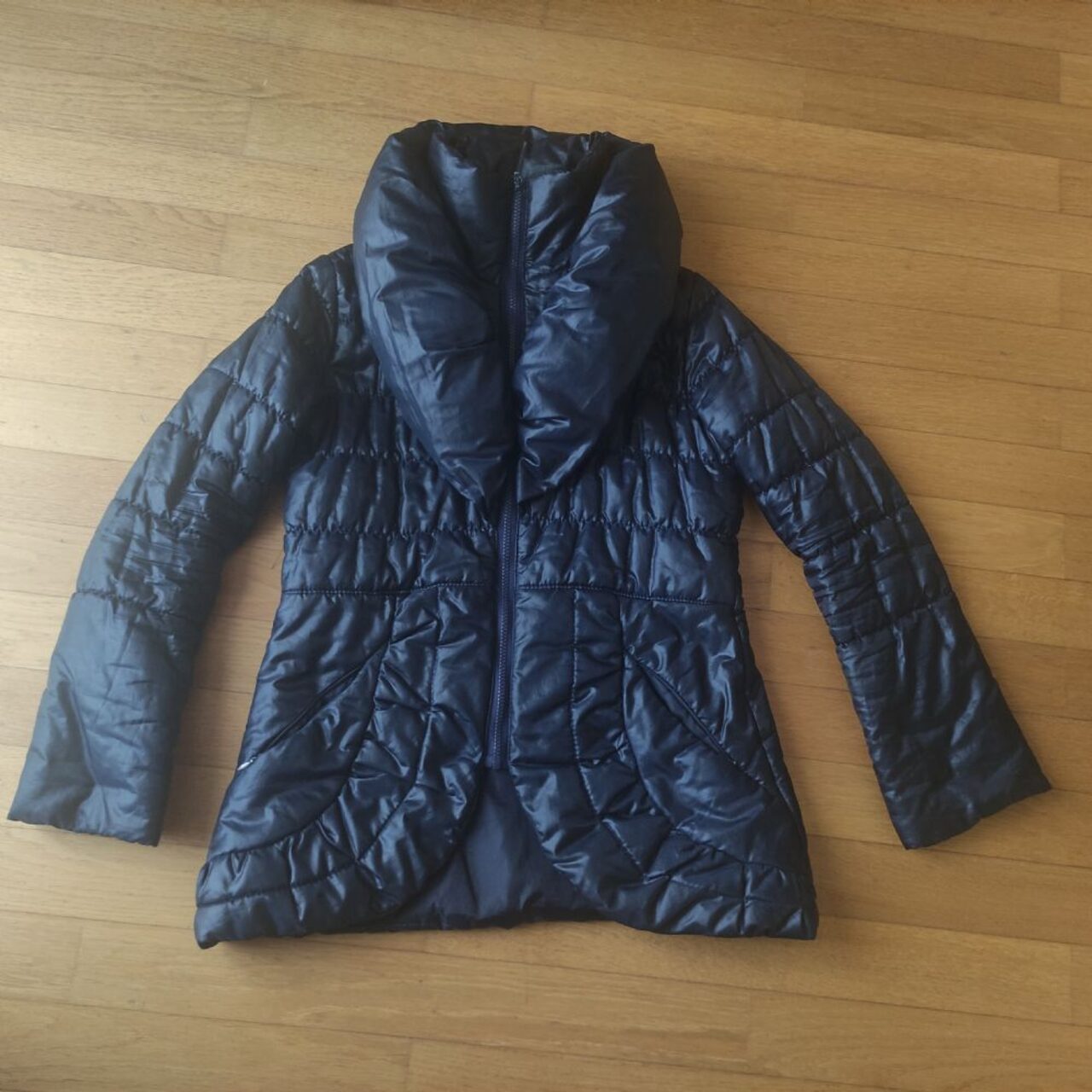 Giacca blu, veste taglia m, chiusa con cerniera, 2 tasche, collo sciallato, ai fianchi. Usata tantoa ancora sfruttabile .