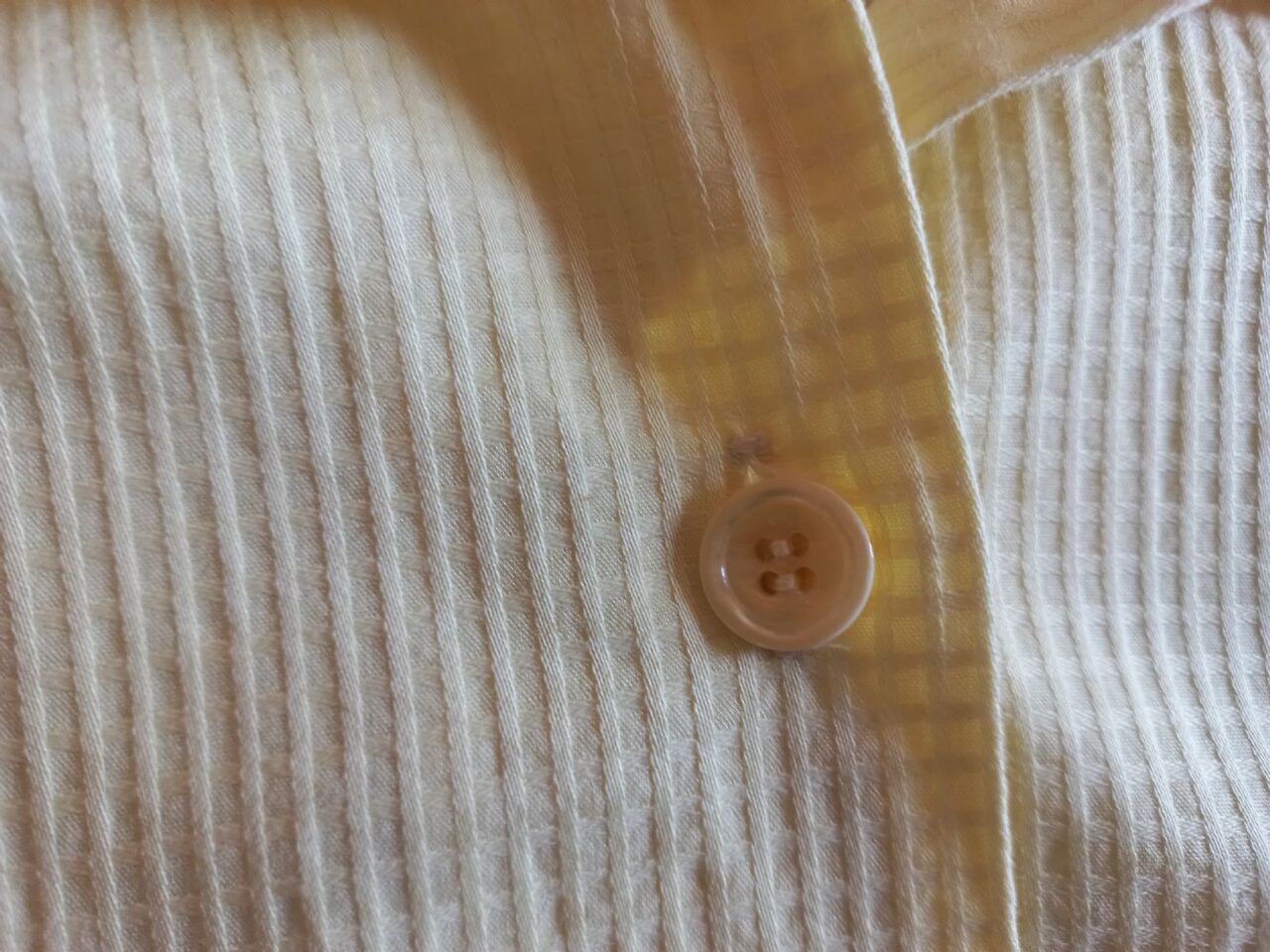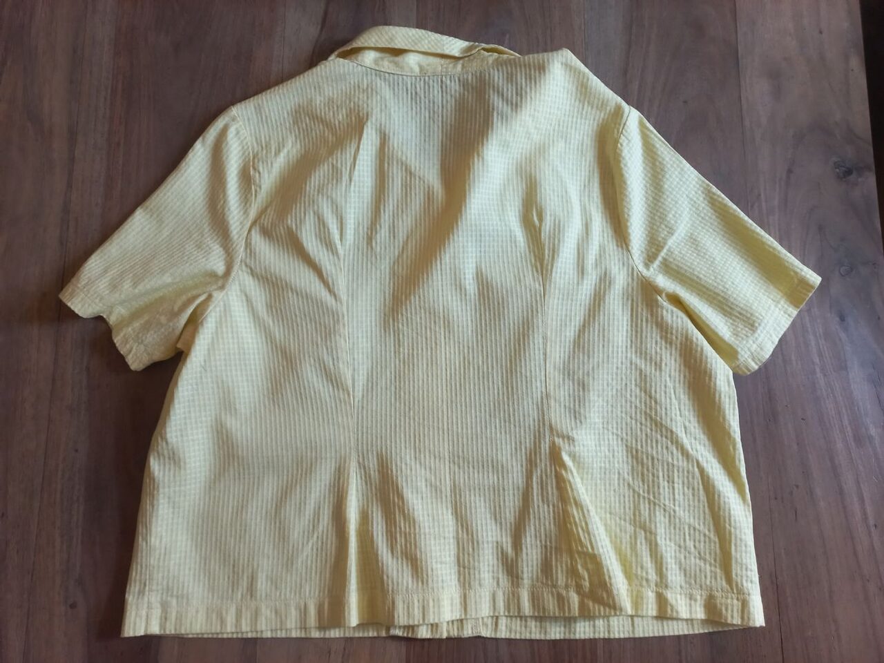 Non ha etichette ma è sicuramente di cotone, la taglia dovrebbe essere una 44 perché mi è stata data da una persona che indossa questa taglia.È leggera, direi estiva, di un bel giallo e tenuta benissimo. .