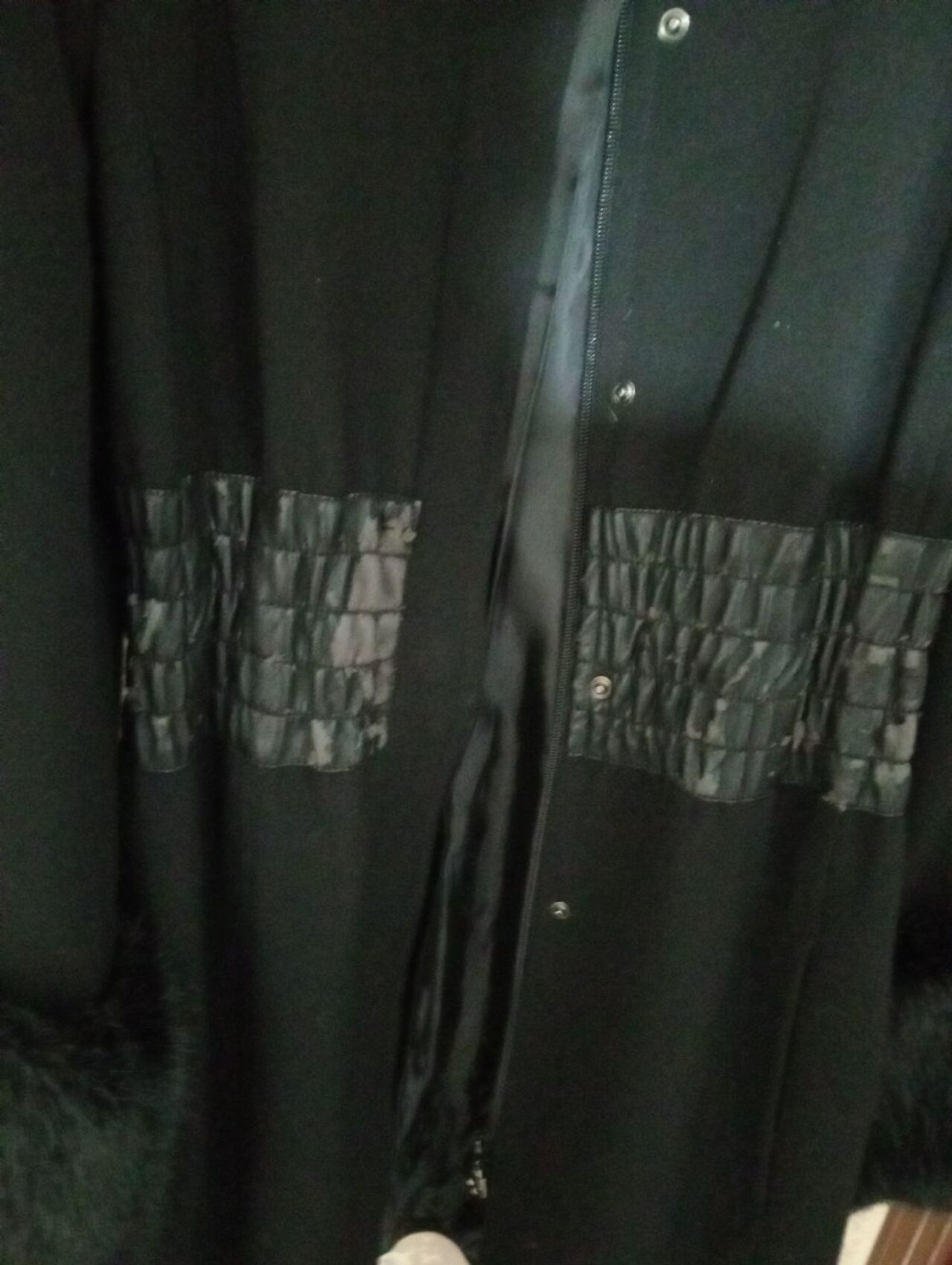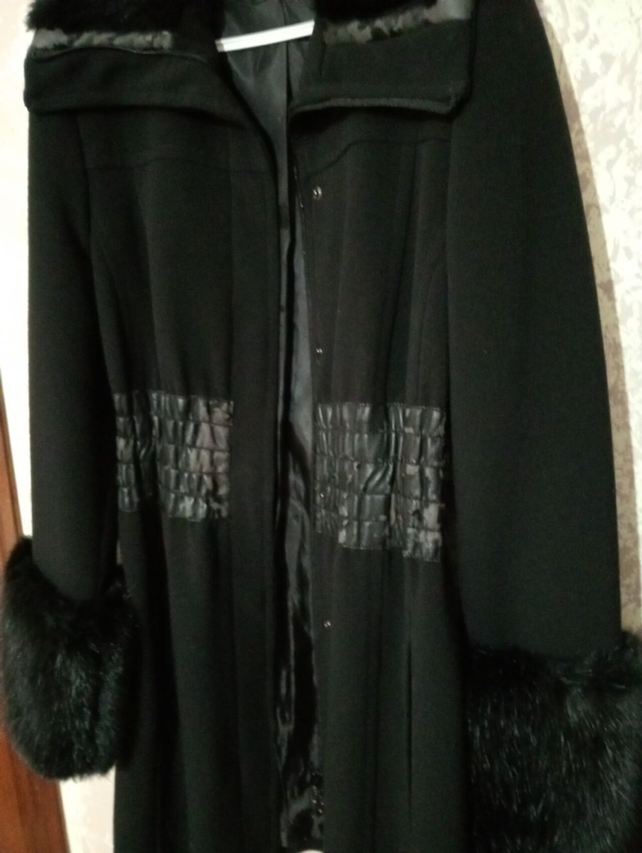 Giaccone donna marca Extasy,taglia 44.Misura spalle cm.38, lunghezza cm.84 e maniche lunghe cm.58.La fascia in pelle al centro ha perso la parte superficiale,io penso che si possa rimediare o staccandola tutta o anche levando la fascia.Qualcosa si può fare,ma non sono un sarto. .