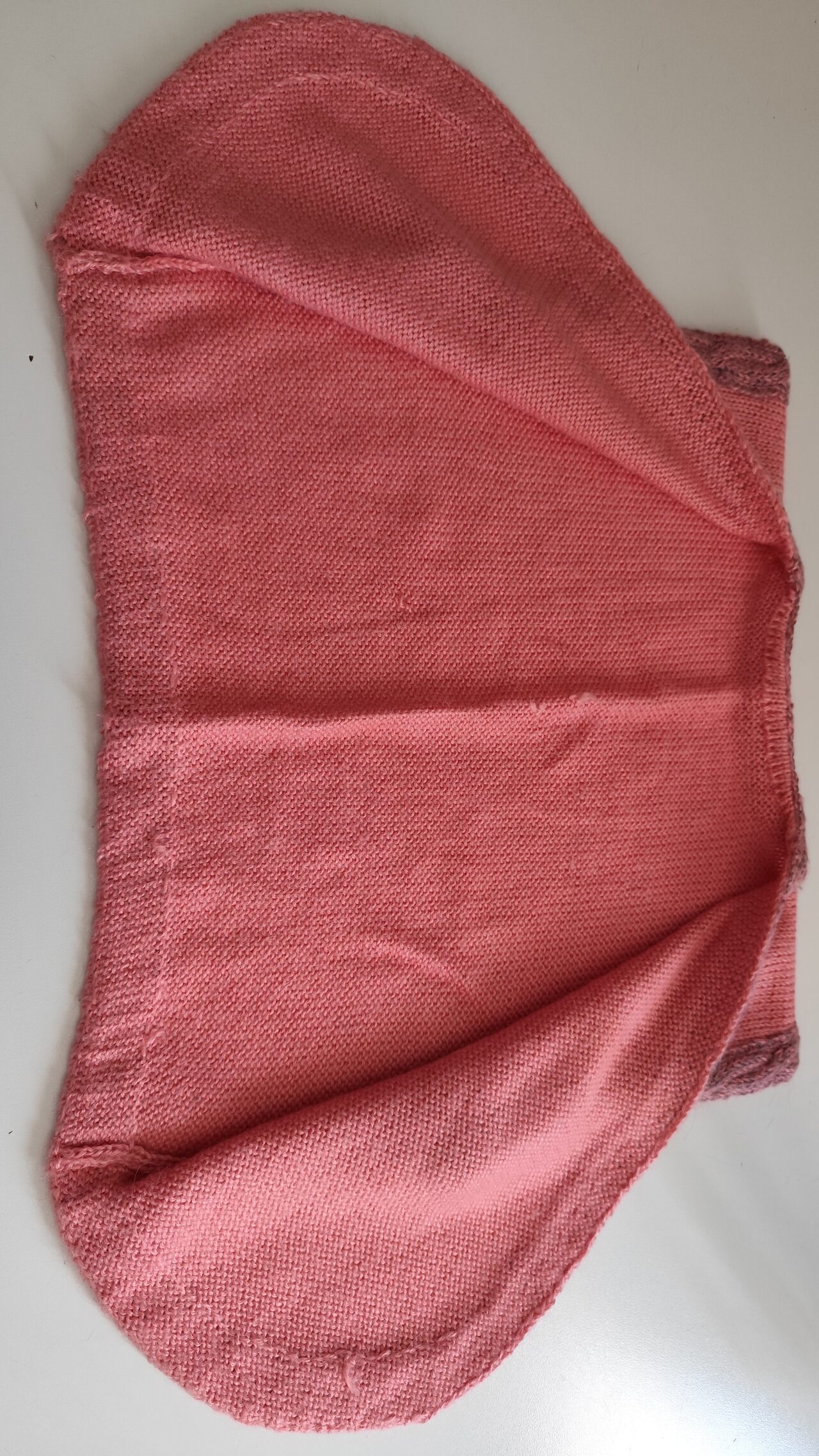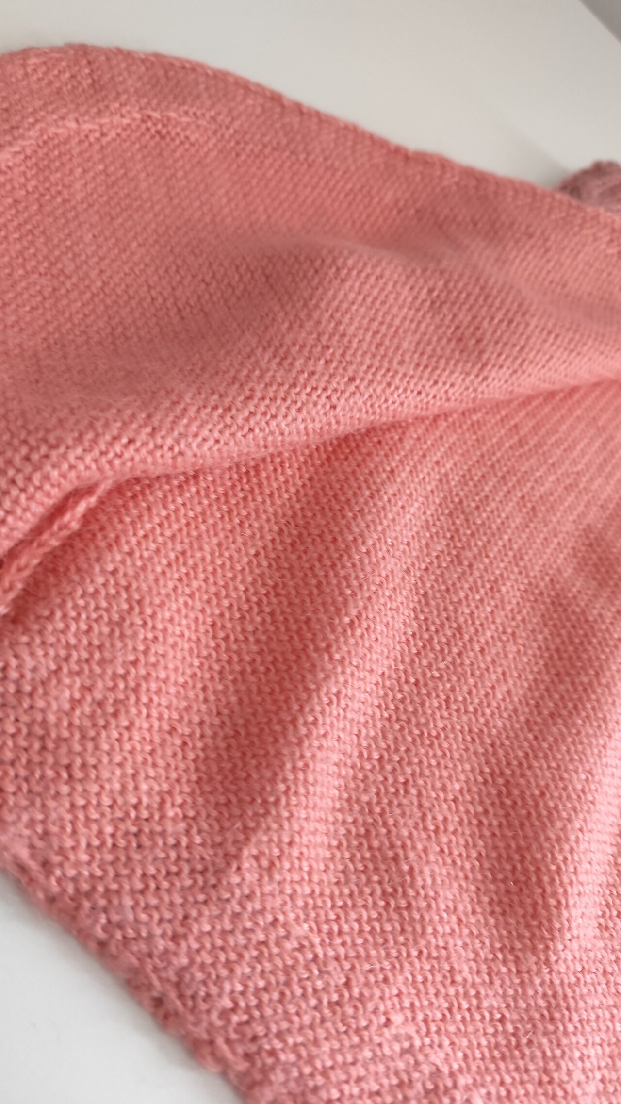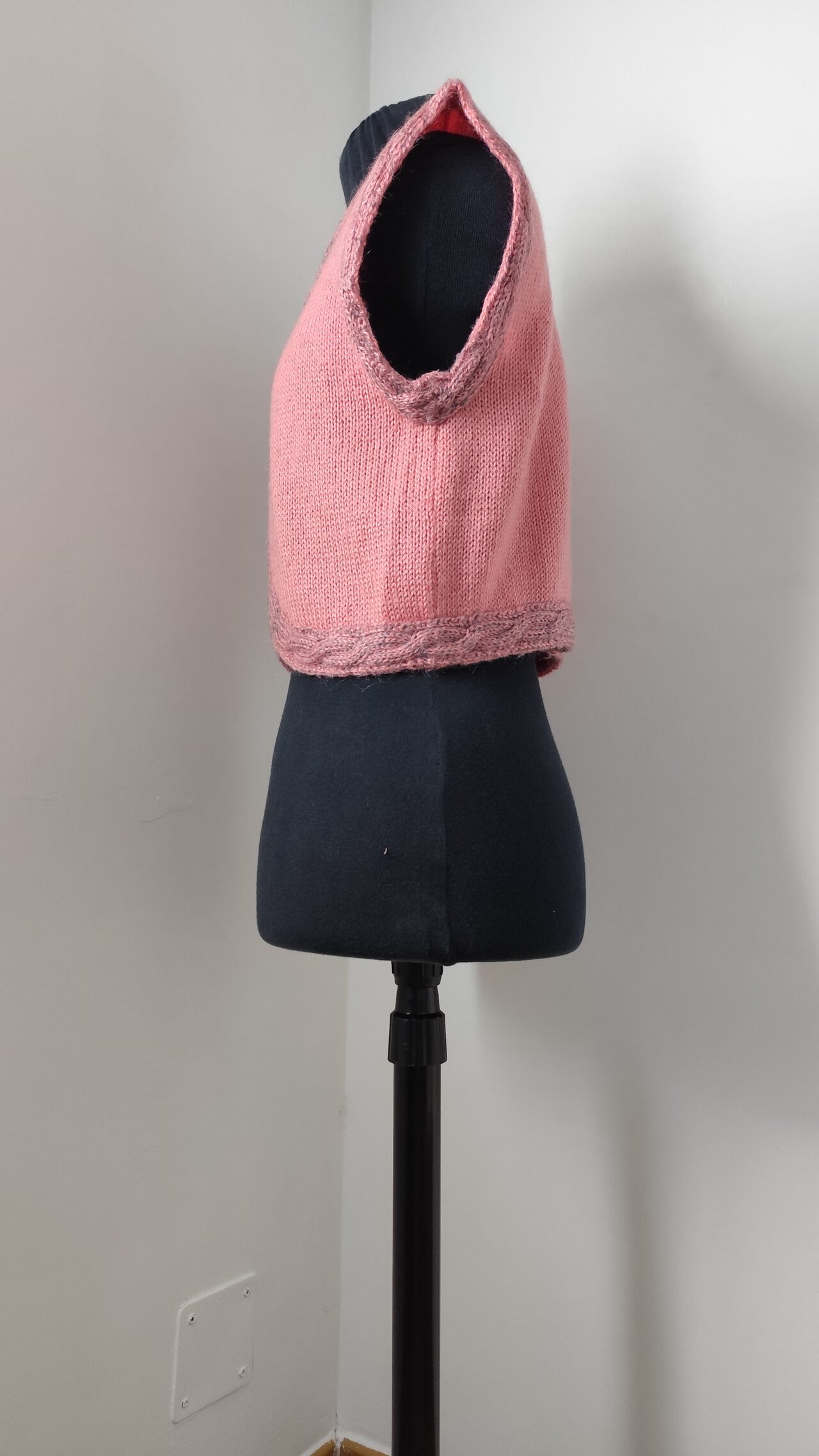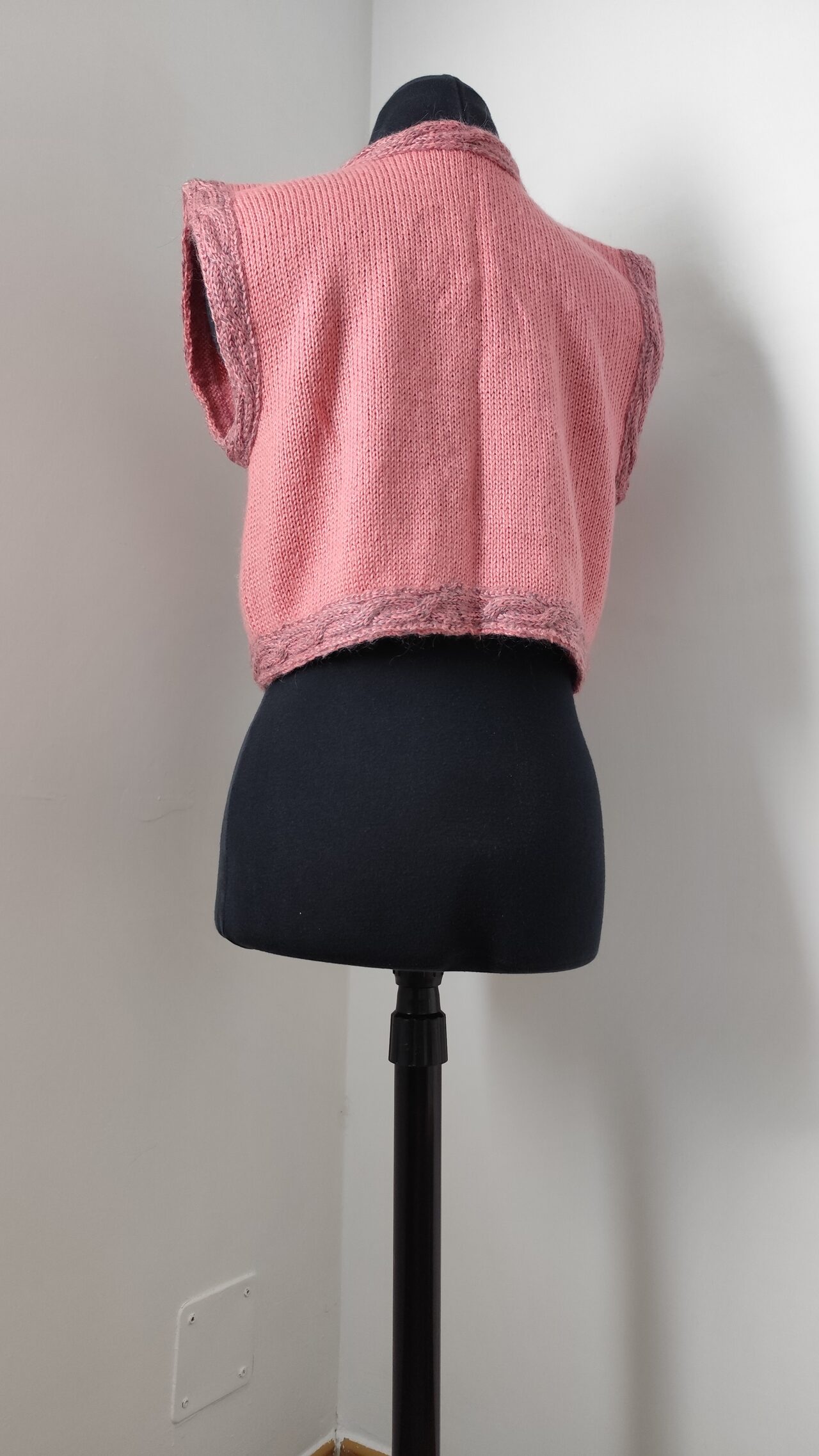 Gilet fatto a mano con lana rosa, lavorazione a maglia rasata, bordi rifiniti con treccia. In perfetto stato, caldo ed elegante, manifattura raffinata e resistente.