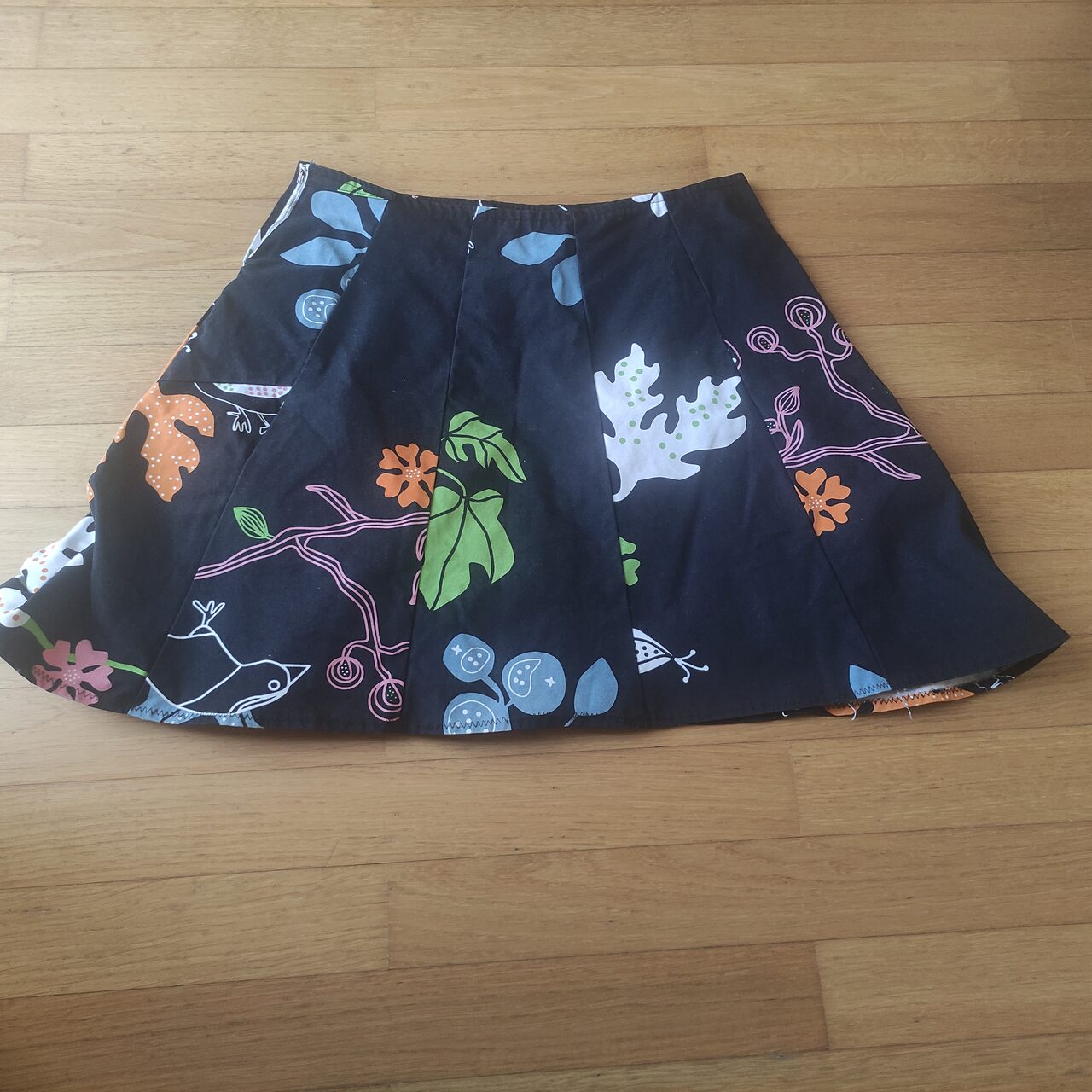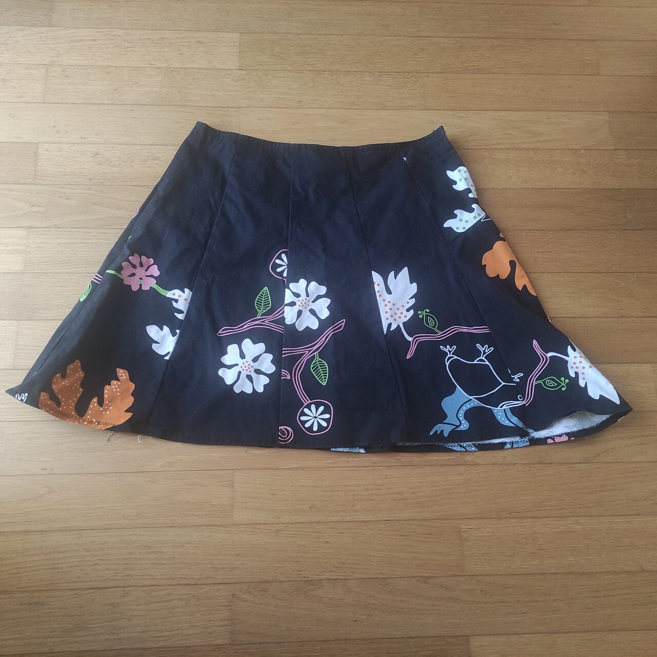 Gonna in cotone pesante, nera con fiori, cerniera, sfoderata. Vita 40 altezza 46 cm .