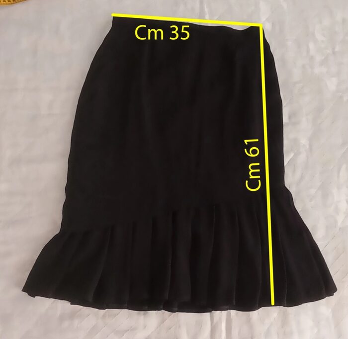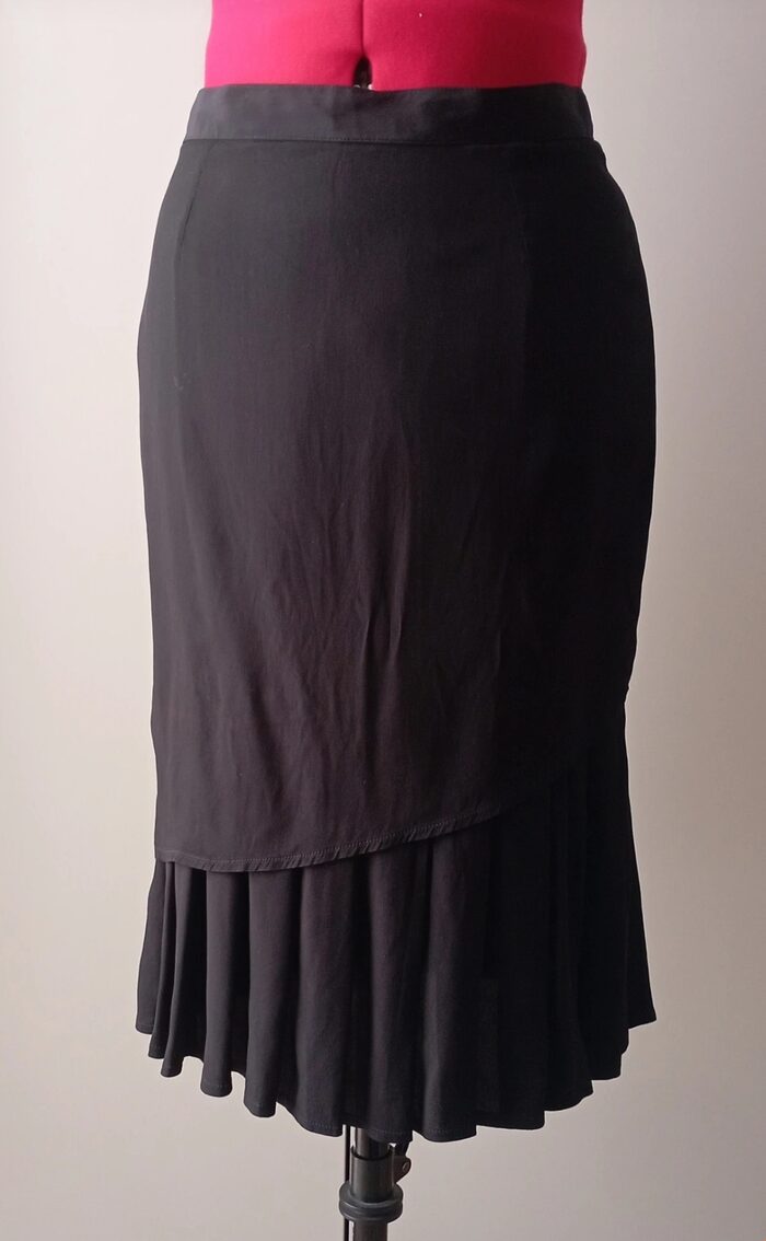 Bellissima gonna vintage nera, tubino a vita alta; è composta da uno strato superiore liscio asimmetrico e uno strato sottostante che si apre formando delle pieghe. Molto particolare ed elegante, in ottime condizioni.