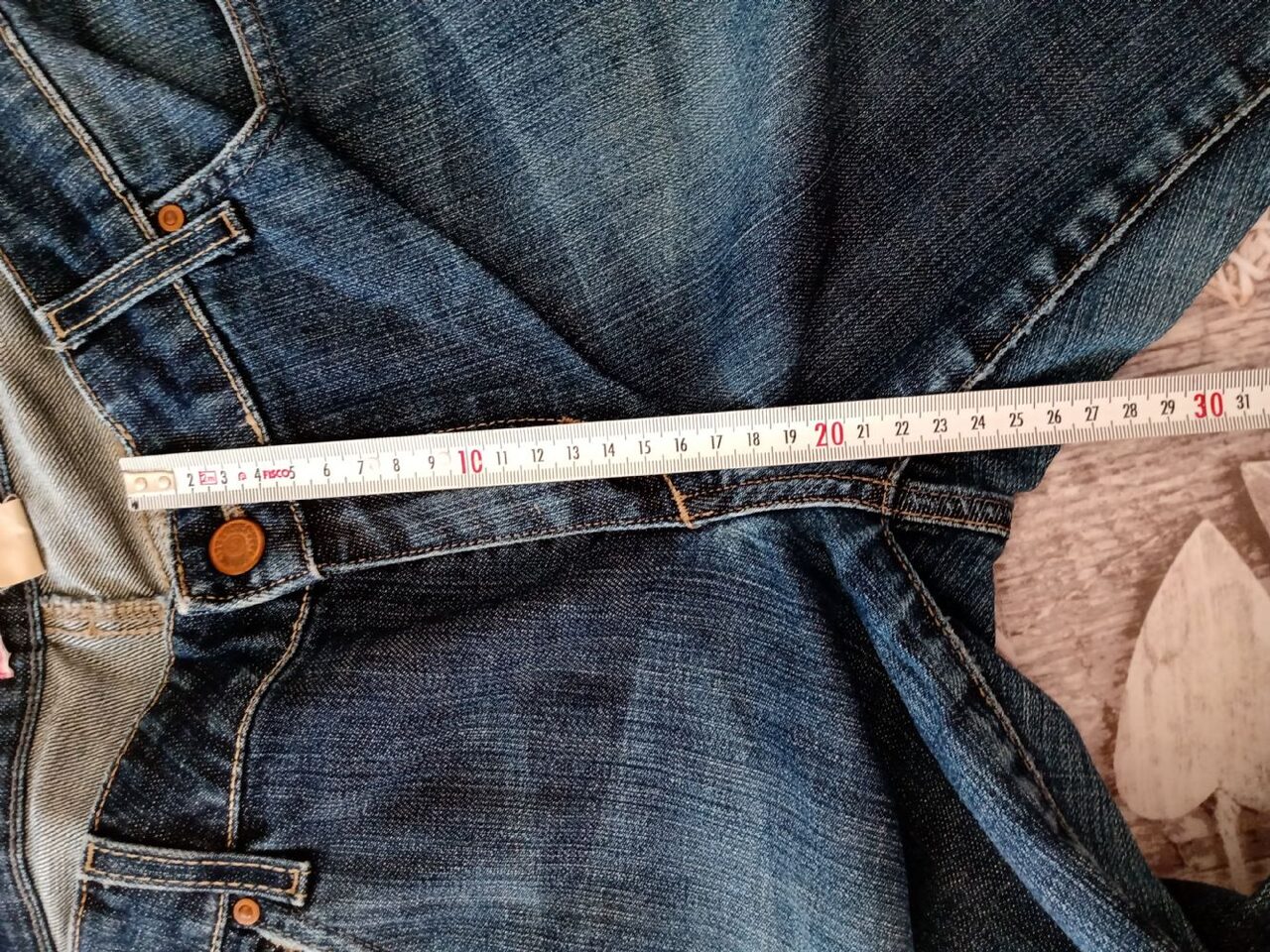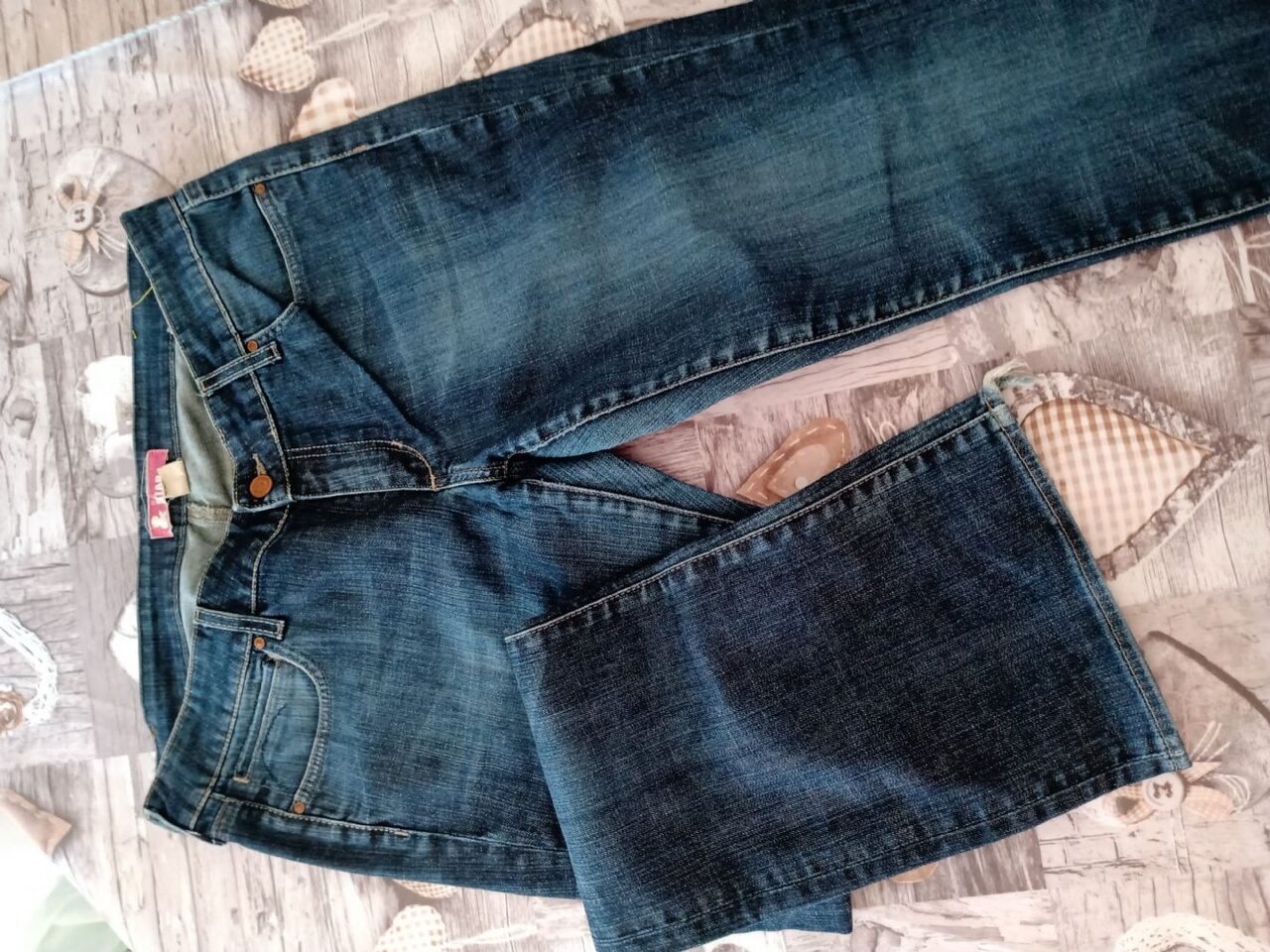 Jeans donna, non capisco la taglia sull''etichetta, mi dà EU 34, cmq visto che anche questi erano della zia direi intorno alla XL. Misura vita 44cm, lunghezza 1m circa. Sul fondo effetto strappato, non so se si vede bene da foto .
