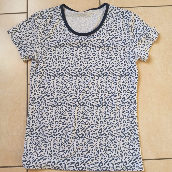 Maglietta,non ha taglia e composizione veste una M comoda,blu e biancaal tatto sembra cotonecome in foto me l'ha data un'amica . .
