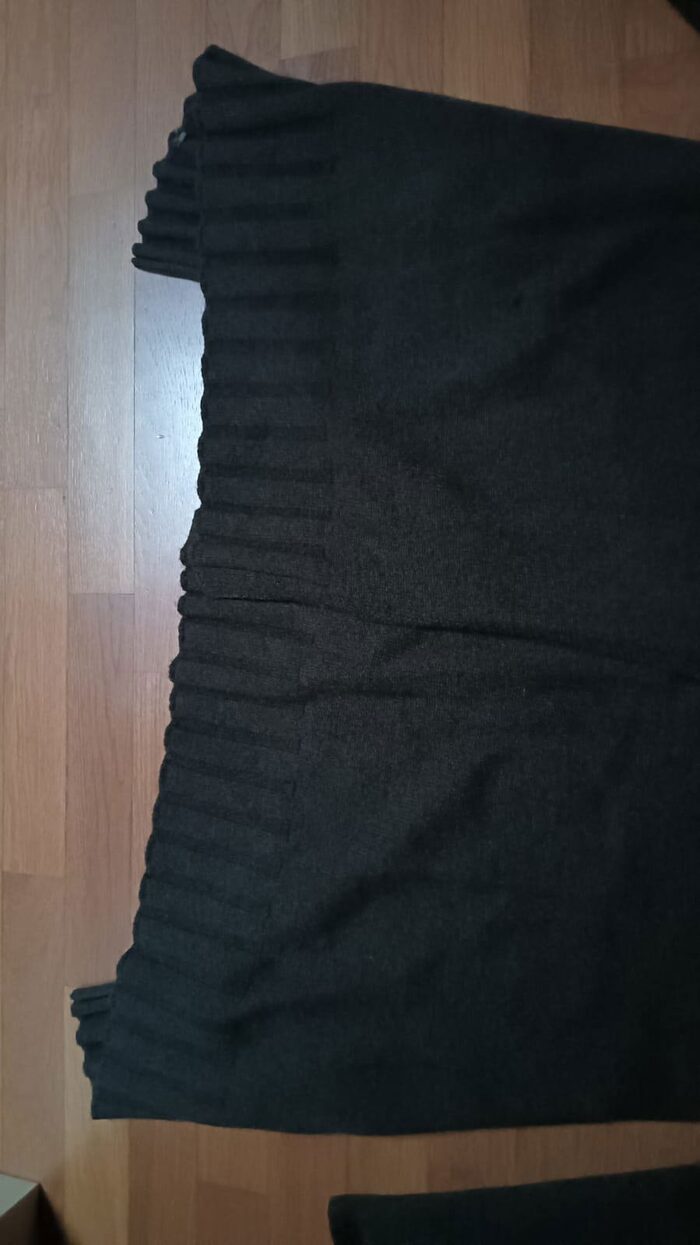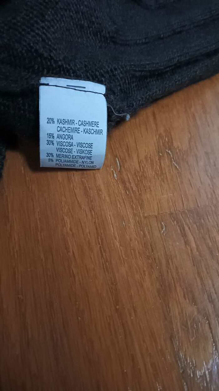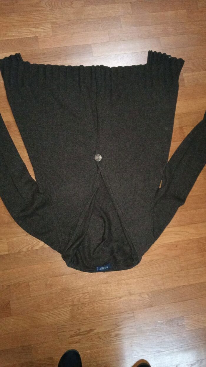lunga inmisto lana colore marrone scuro conun bottone centrale dietro più corta che sul davanti qualche elggero pallino il resto ok tg grande .Misure spalle 50* ascella-ascella 56*lunghezza 81 .