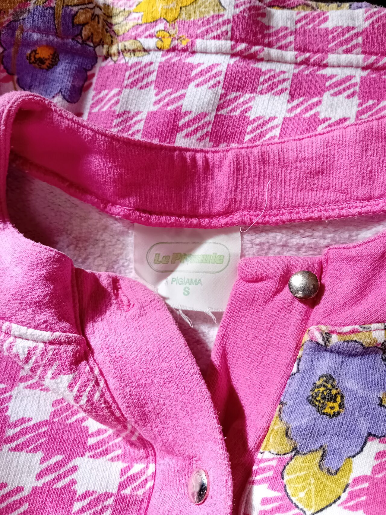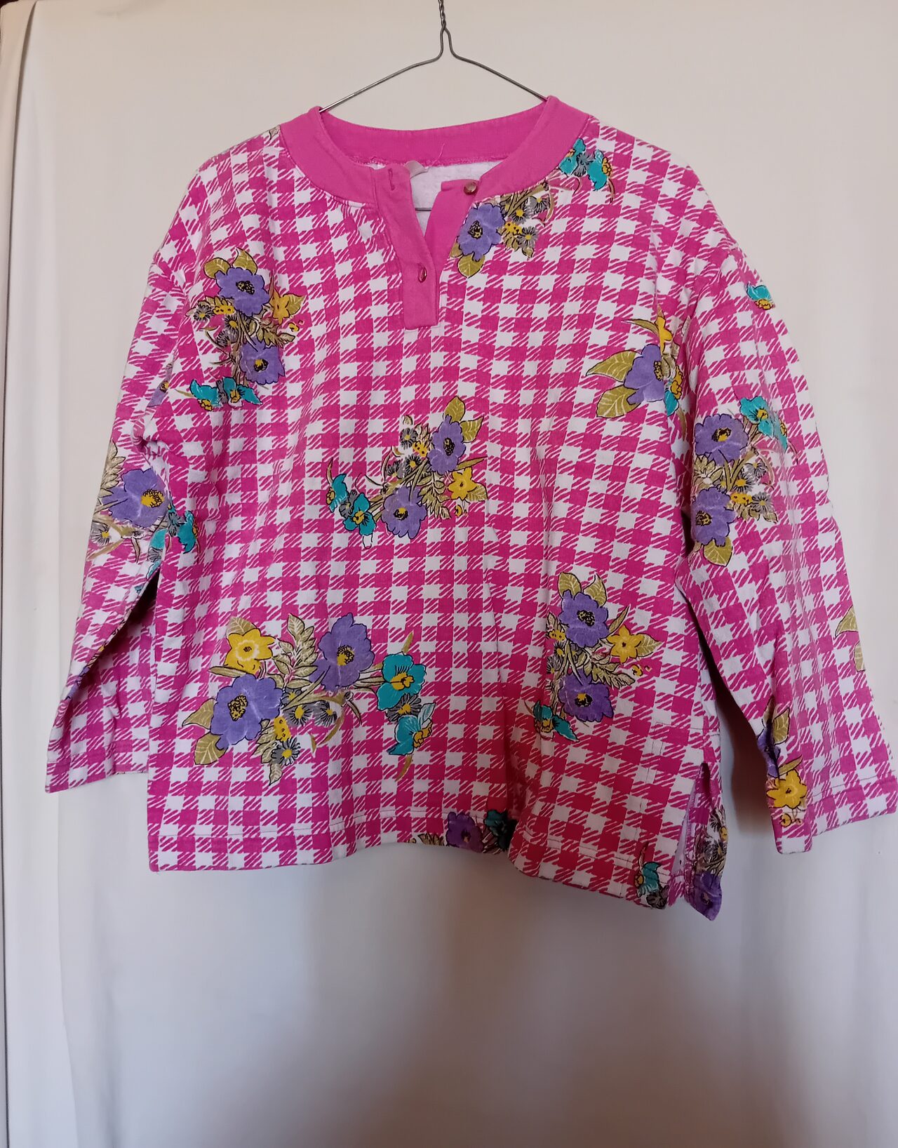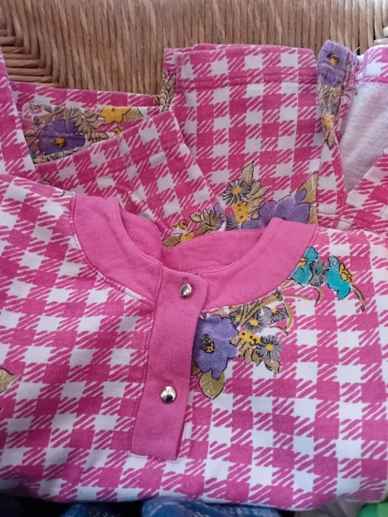 Presa qui ma non usata. Puro cotone. Il tessuto non è come nuovo, e bisogna dare due punti sotto le ascelle, dove sta iniziando a scucirsi (ultime 2 foto), ma non sono consumate o altro, è ancora in buone condizioni per un pigiama. Indica taglia S ma è abbondante: spalle 51 e ascelle 56 cm, quindi metto tg unica. .