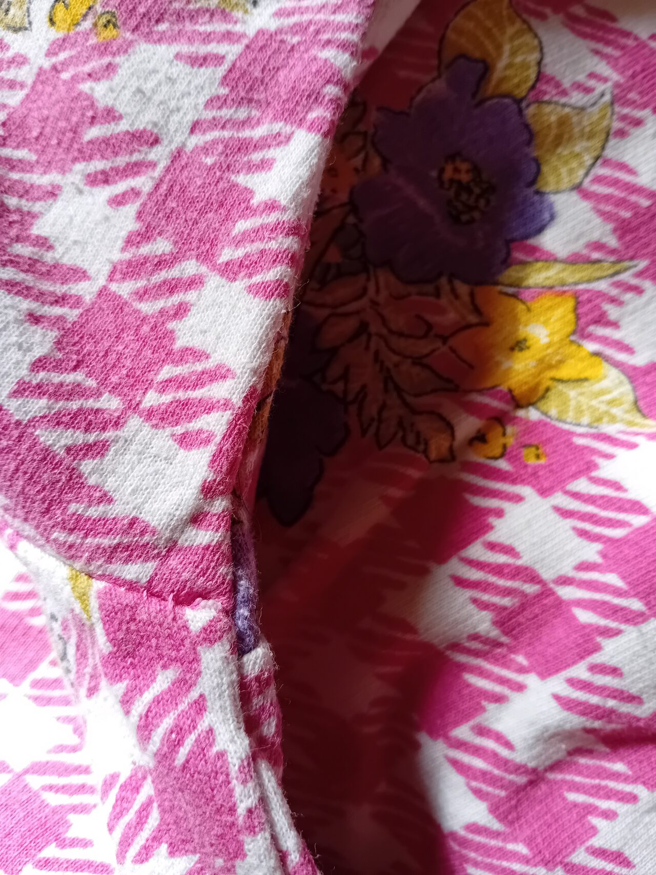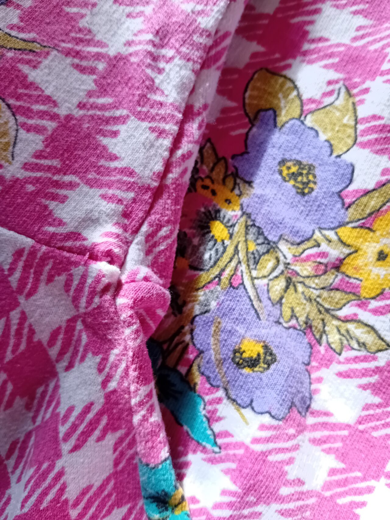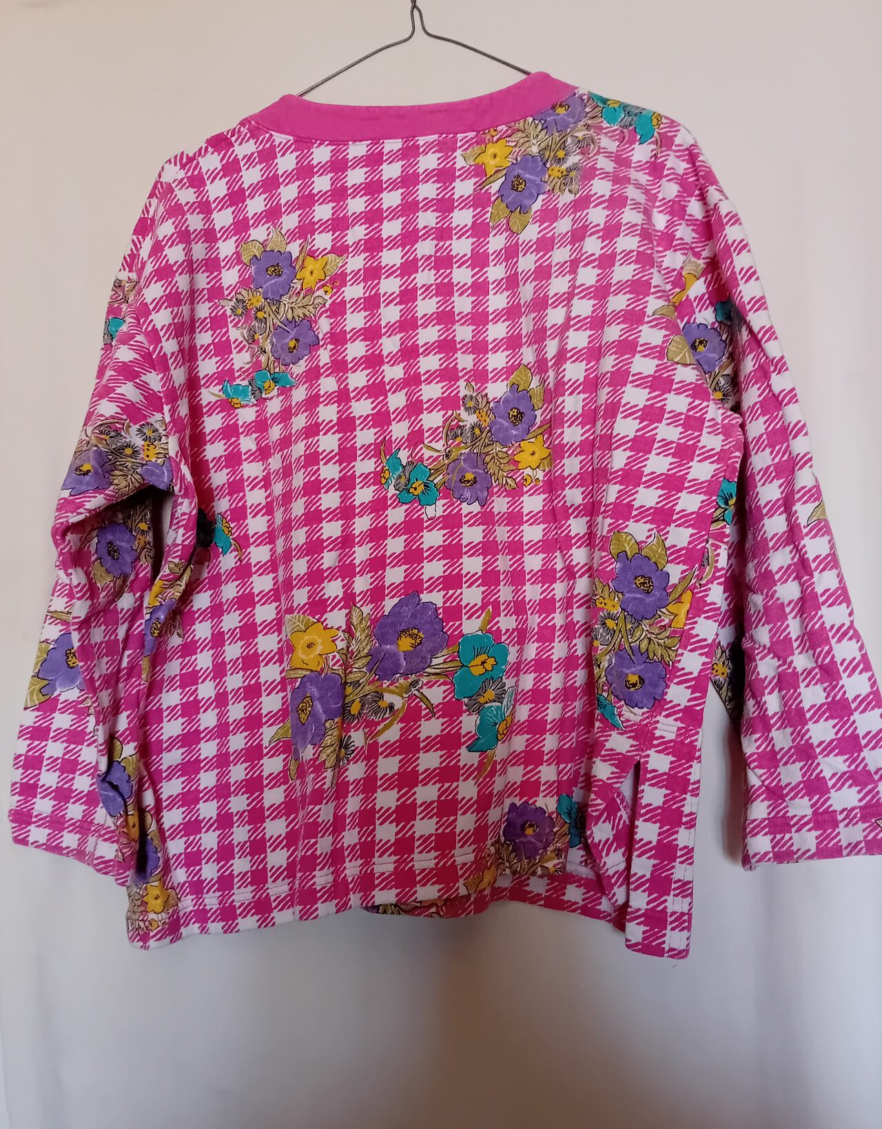 Presa qui ma non usata. Puro cotone. Il tessuto non è come nuovo, e bisogna dare due punti sotto le ascelle, dove sta iniziando a scucirsi (ultime 2 foto), ma non sono consumate o altro, è ancora in buone condizioni per un pigiama. Indica taglia S ma è abbondante: spalle 51 e ascelle 56 cm, quindi metto tg unica. .