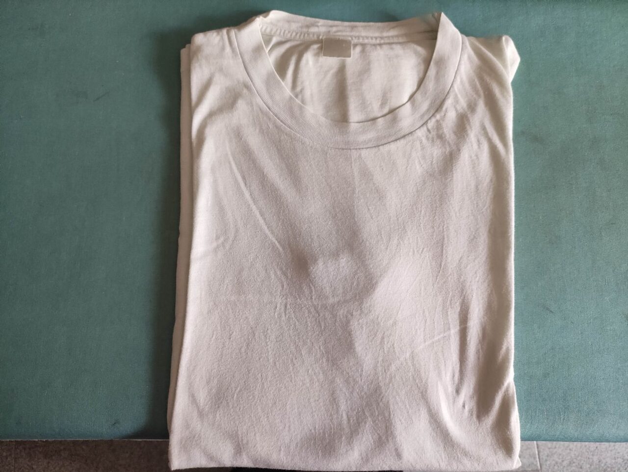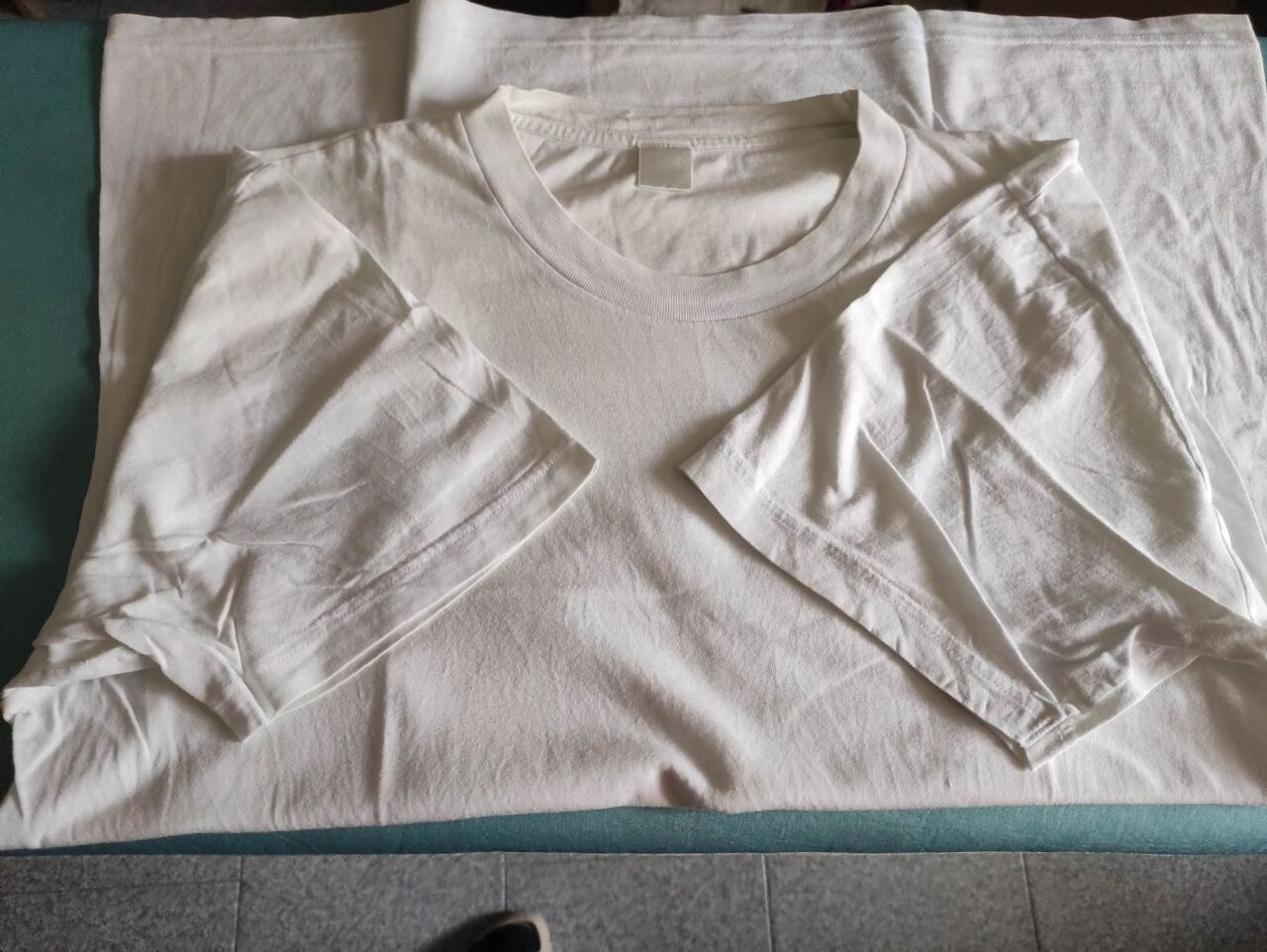 Nessun difetto. Manica corta Cotone 100%, taglia 7 anche se le etichette non si leggono più, in maglia tubolare, cioè senza cuciture sui fianchi .