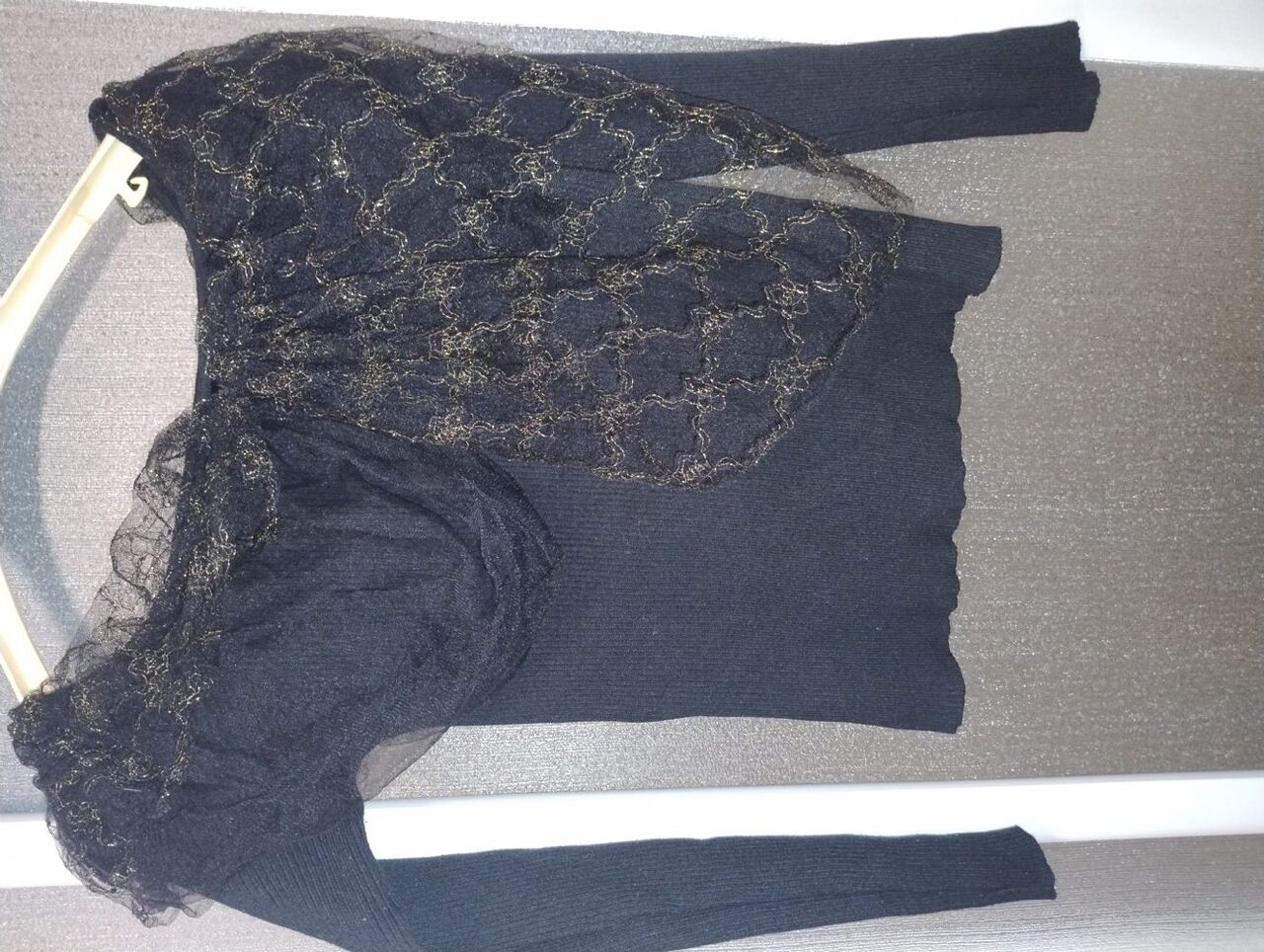 Maglia nera Tessuto a costineNon vedo difetti se non qualche micro pallino ma non visibile perché sotto al tulle.Viscosa e poliestere .