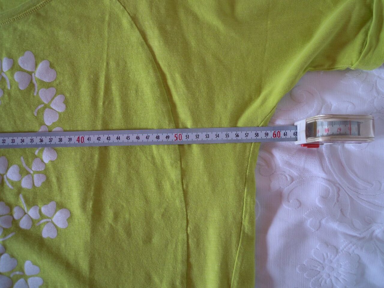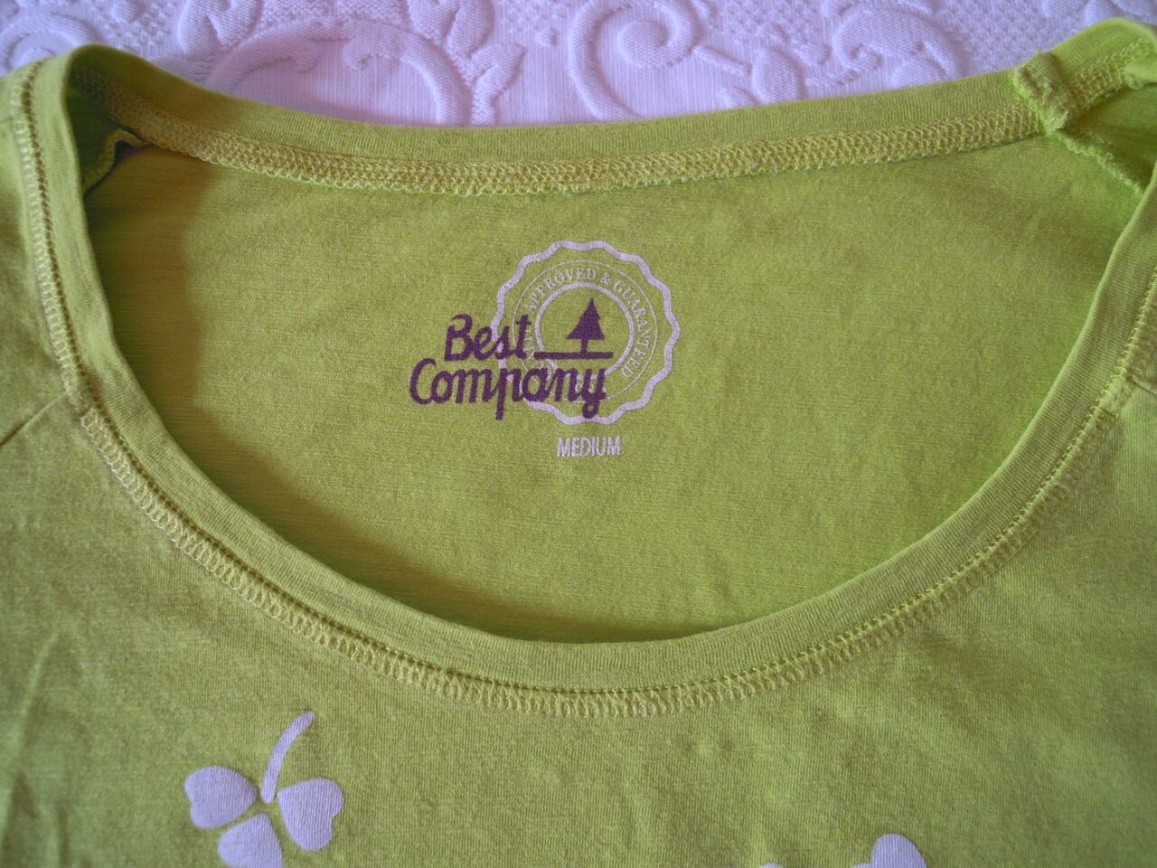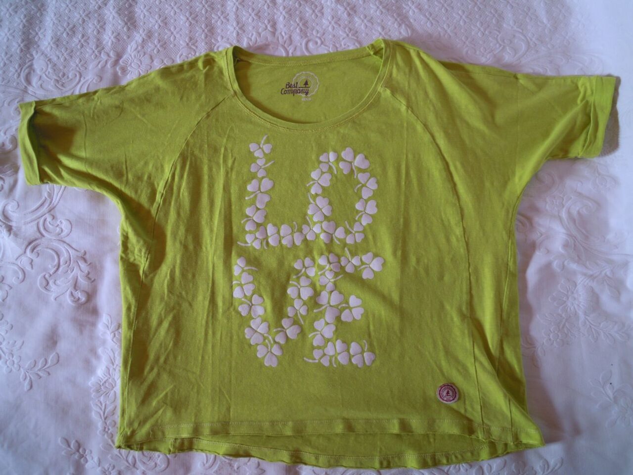 Maglietta verde best company, c'è scritto taglia M, metto comunque le misure che ho preso: larghezza 57 cm circa, lunghezza 55 cm circa. Non è usurata, ma un po'' vecchiotta. 95% cotone .